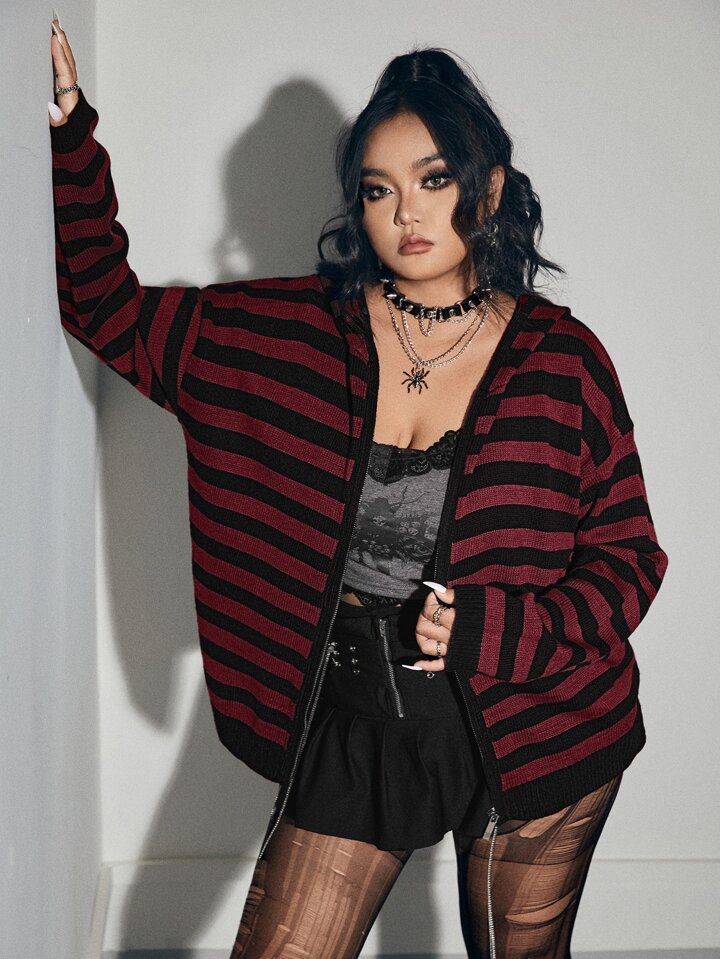 Grunge Punk Cárdigan de hombros caídos a rayas talla grande