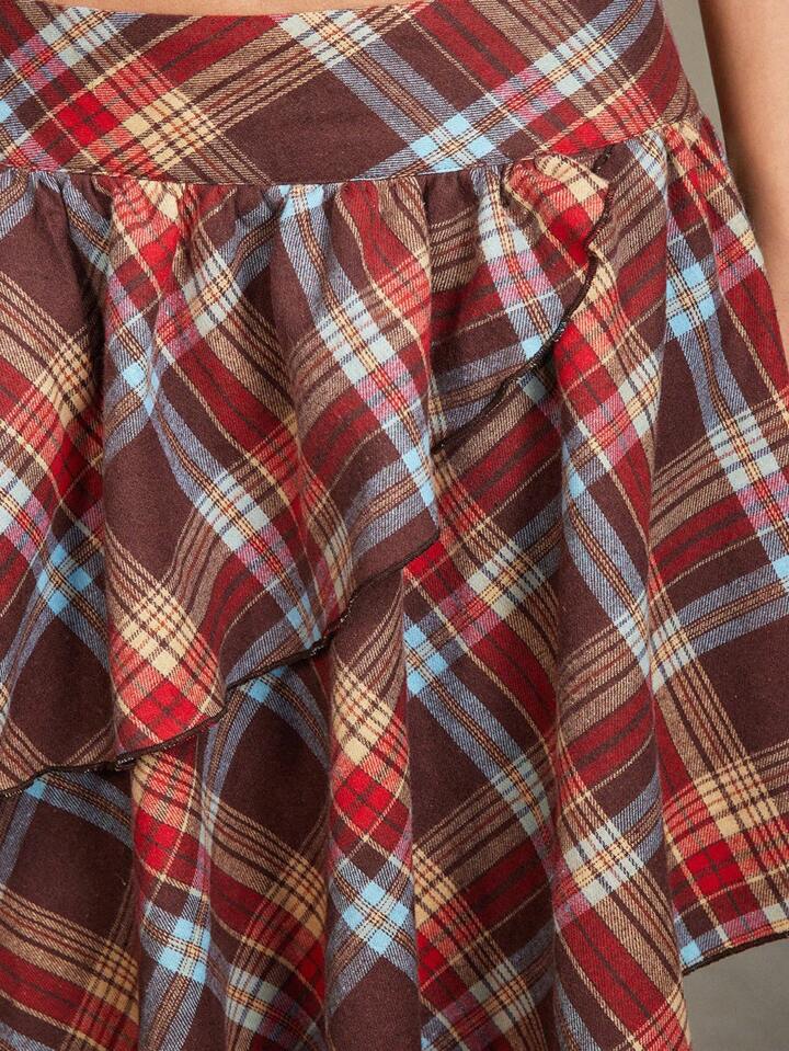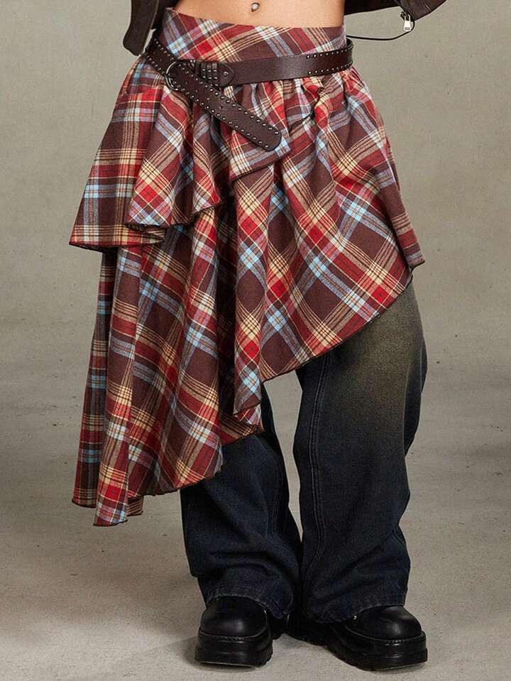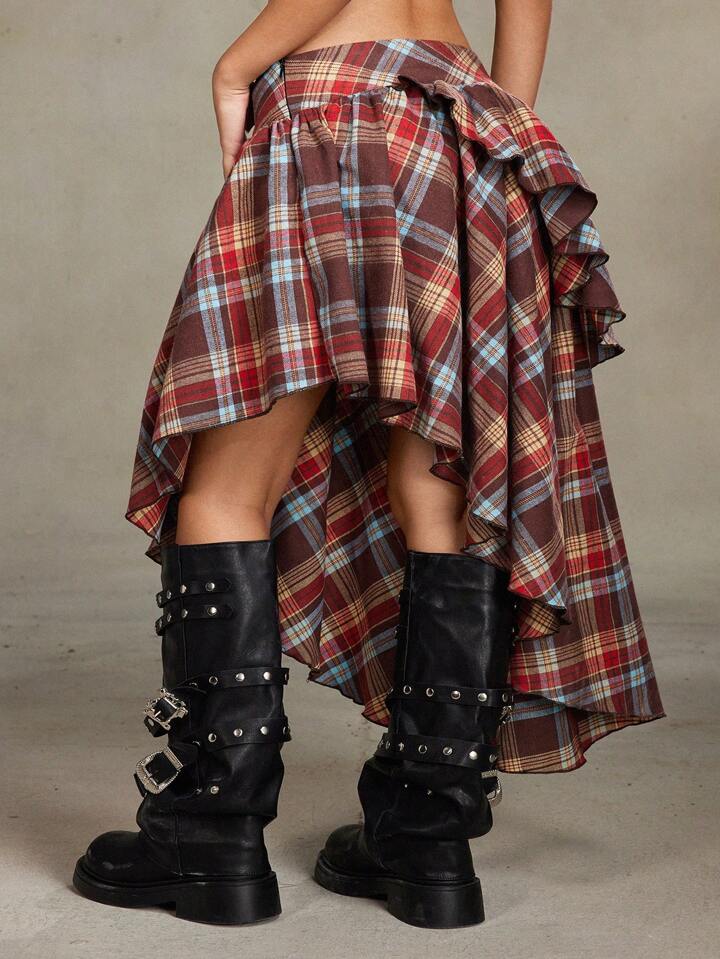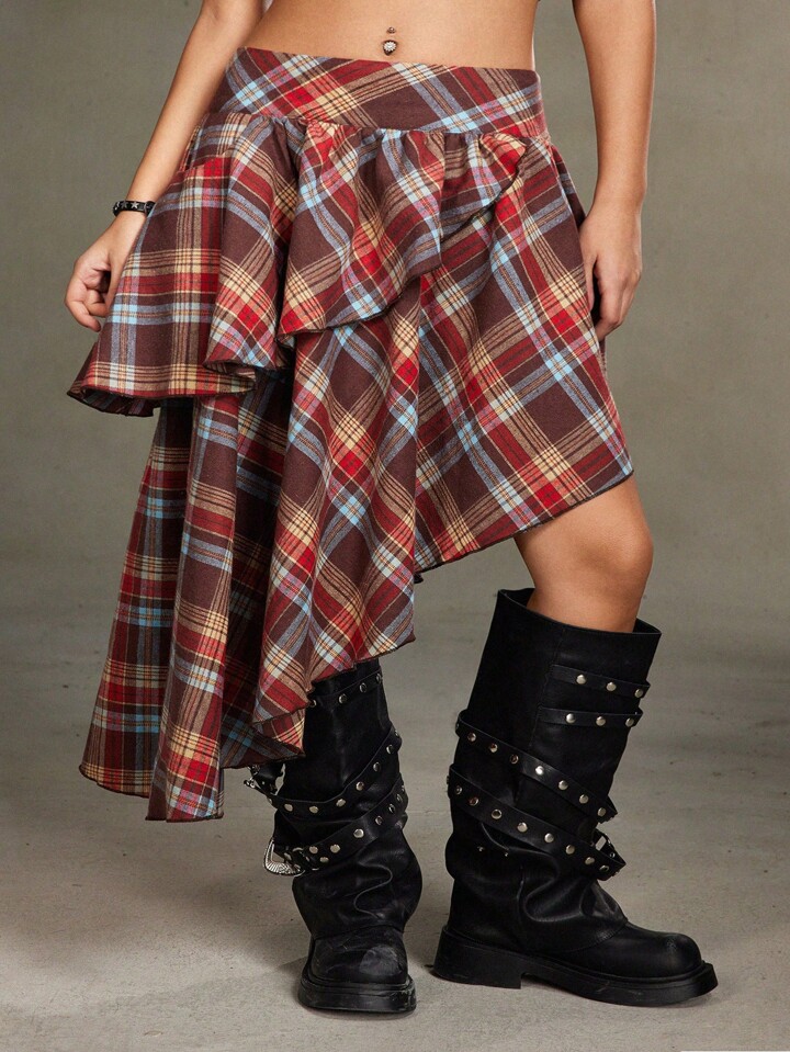 Grunge Punk Falda asimétrica con volantes de estilo vintage a cuadros, estilo festival de música callejera para tallas grandes