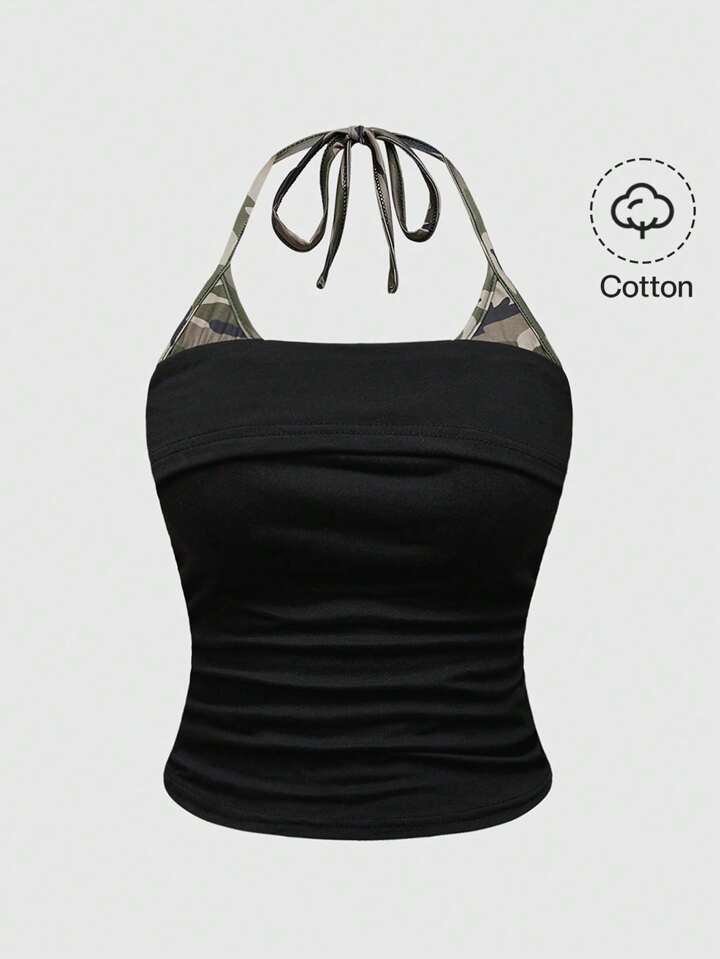 Grunge Punk Top de tirantes de color negro y verde con parches y contraste para mujer talla grande Cam