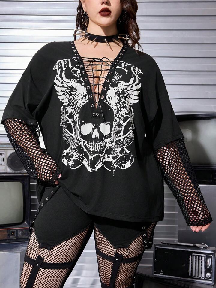 Grunge Punk Camiseta de talla grande para mujer con estampado de calavera punk oscuro, con ata delantero, hombros caídos y cintas metálicas, adecuada para festivales de música