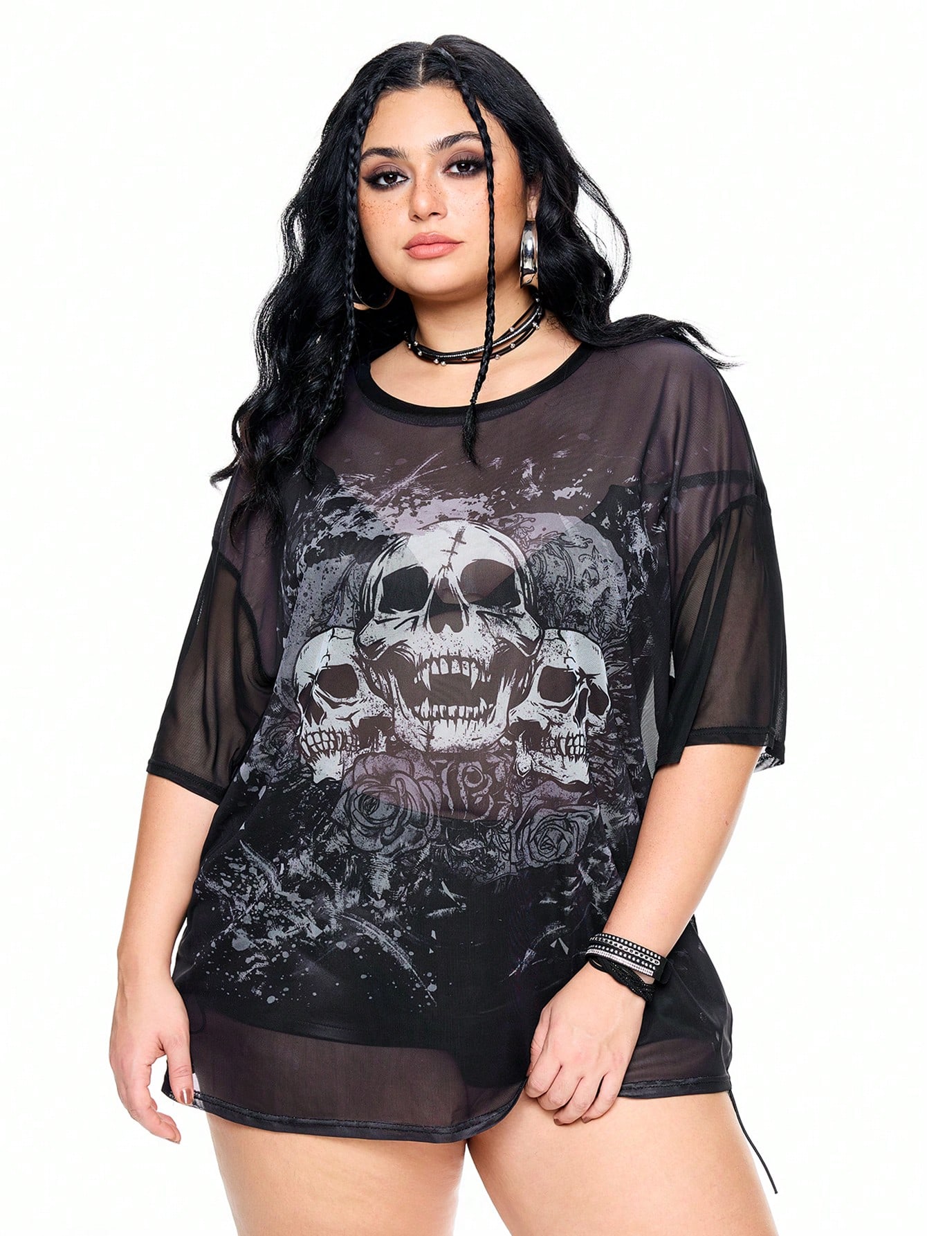 Grunge Punk Blusa de talla grande para mujeres con estampado de calavera y rosa, estilo punk
