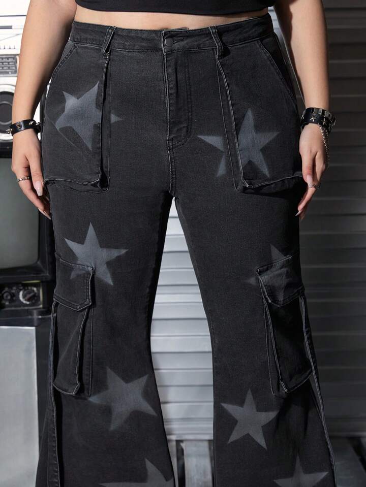 Grunge Punk Jeans acampanados con elásticos y bolsillos decorativos con estampado de estrellas para mujer de talla grande