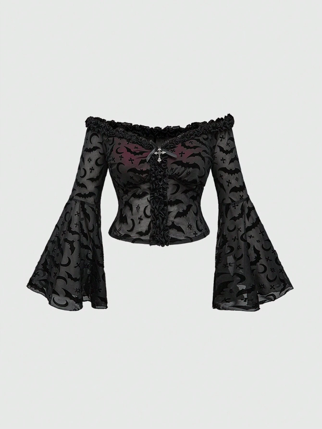 Grunge Punk Blusa de mujer de talla grande con volantes, manga acampanada, lazo y estampado vintage punk gótico de murciélago, luna y cruz
