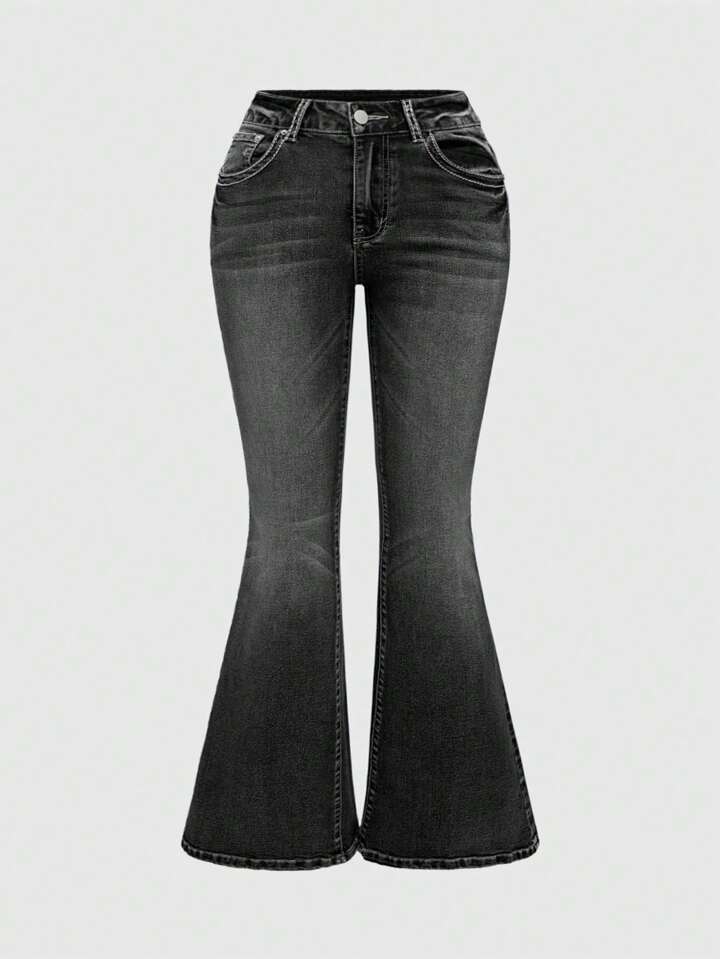 Grunge Punk Jeans acampanados de talla grande para mujeres con bordado de alas y decoración de rhinestones