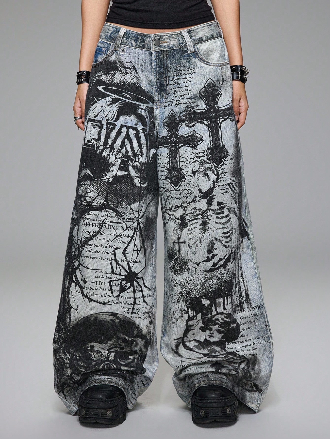 Grunge Punk Jeans de pierna ancha con estampado total de cruz, calavera, ángel y araña de estilo punk oscuro para mujer de talla grande
