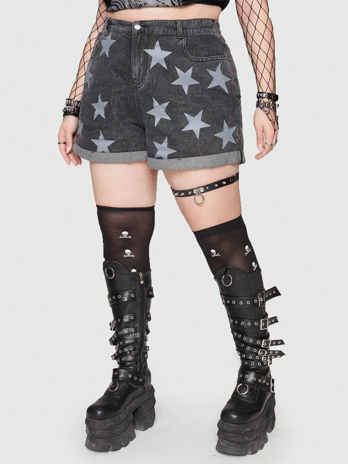 Grunge Punk Talla grande Shorts en mezclilla con estampado de estrella bajo de doblez