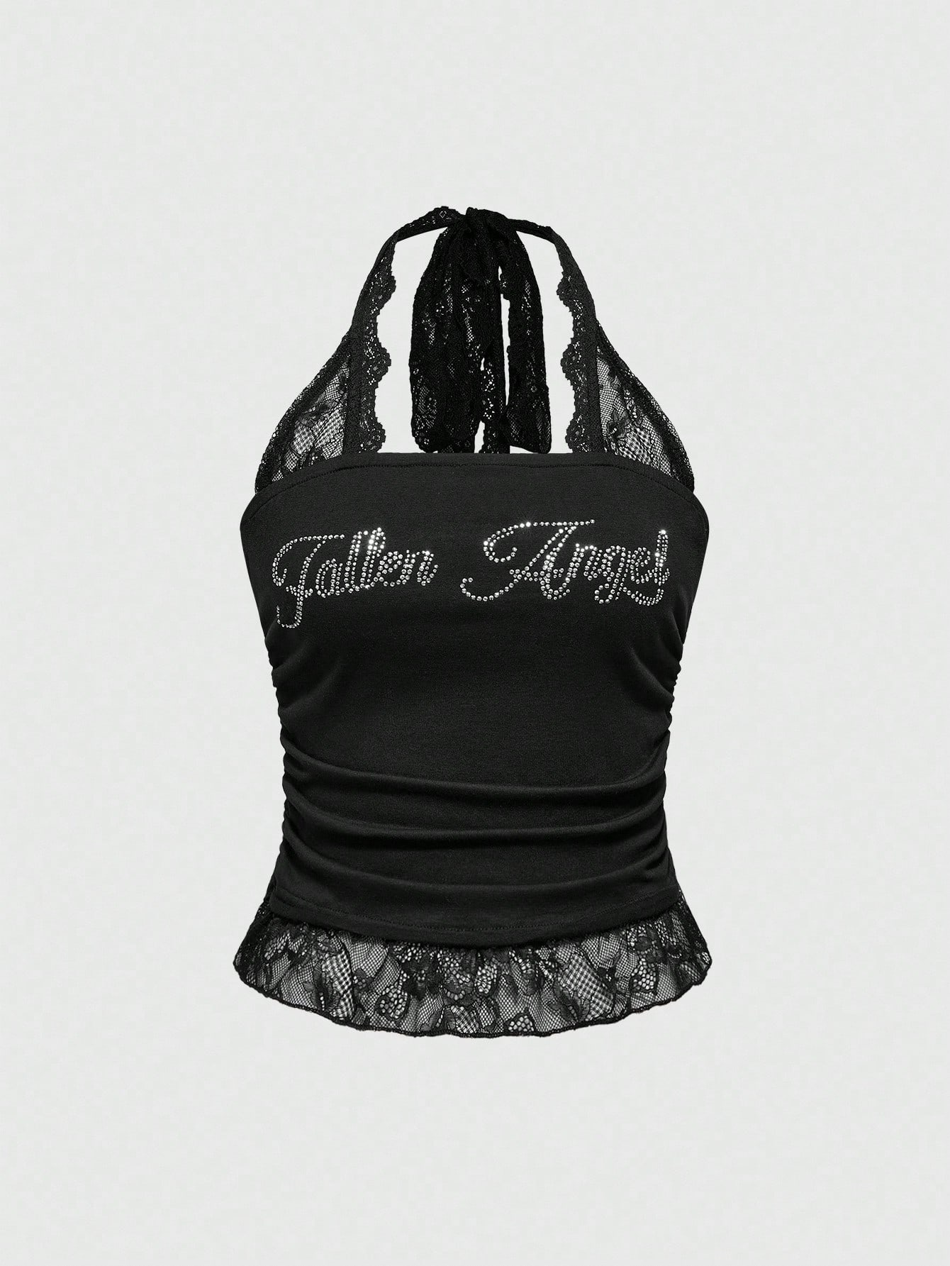 Grunge Punk Top ajustado de cuello halter con parches de strass y encaje estilo punk para mujeres