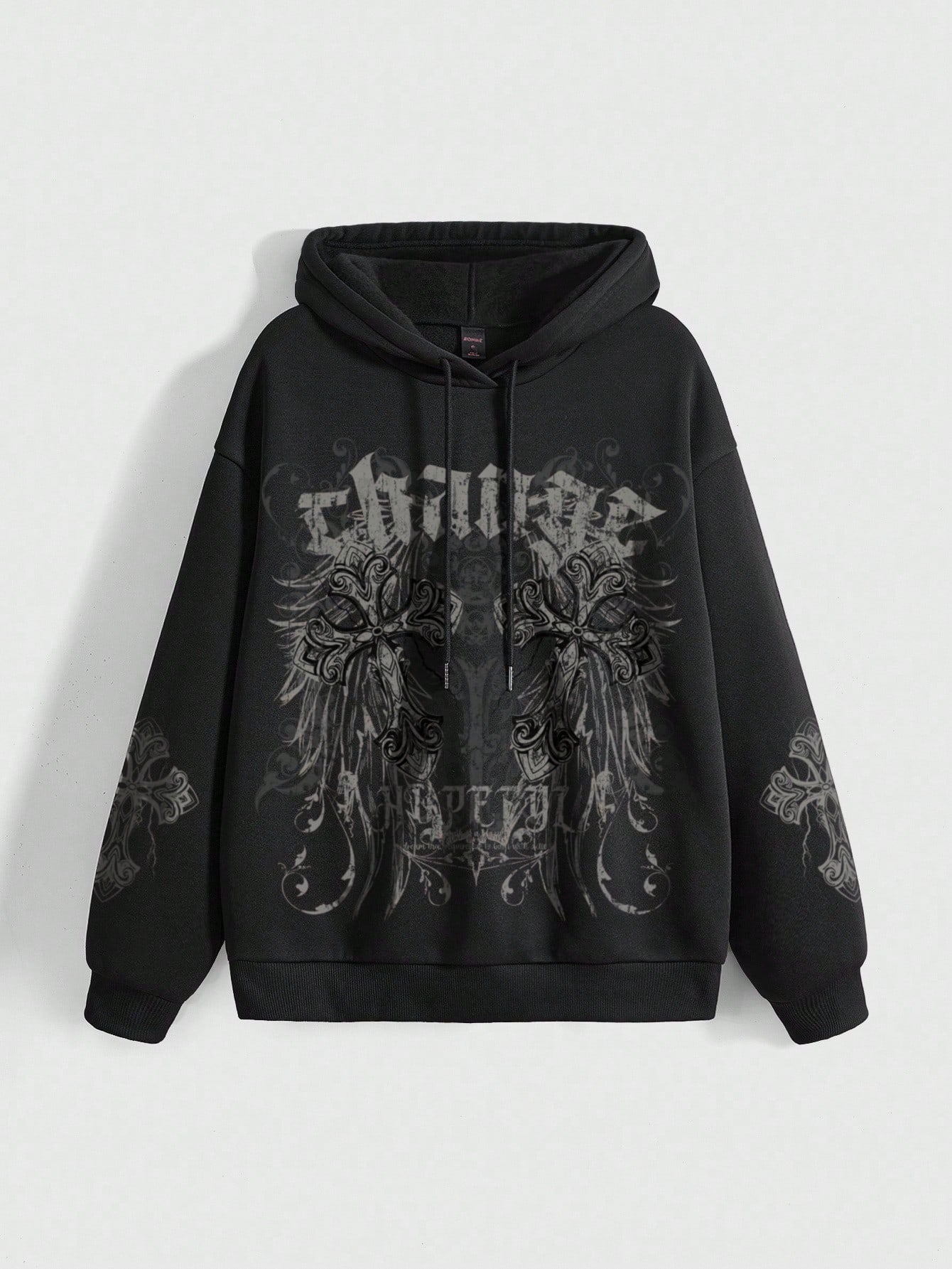 Grunge Punk Sudadera holgada con bolsillo, estampado gráfico de cruz y vid, estilo punk gótico oscuro, color negro para mujer, otoño/invierno