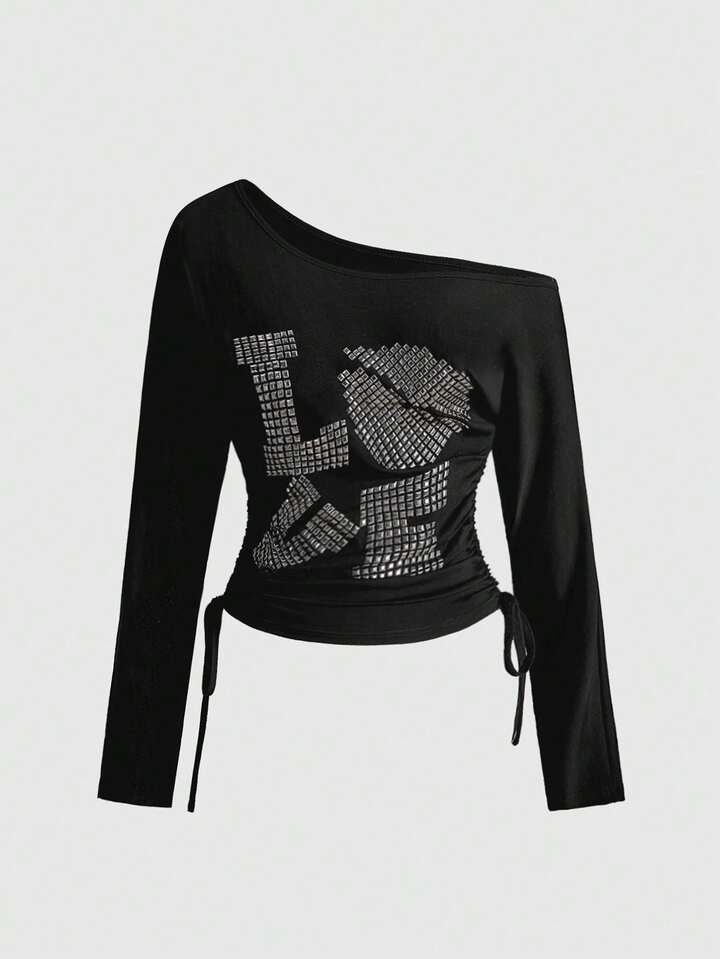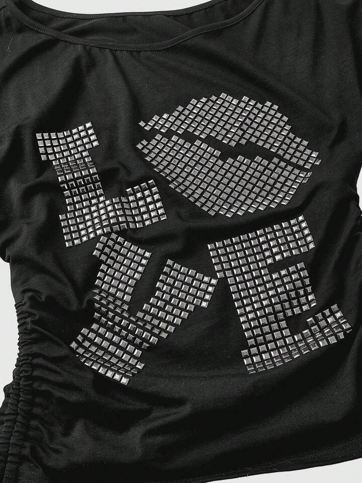 Grunge Punk Top ajustado con mangas de murciélago, hombros oblicuos y remaches con diseño "LOVE" en estilo punk