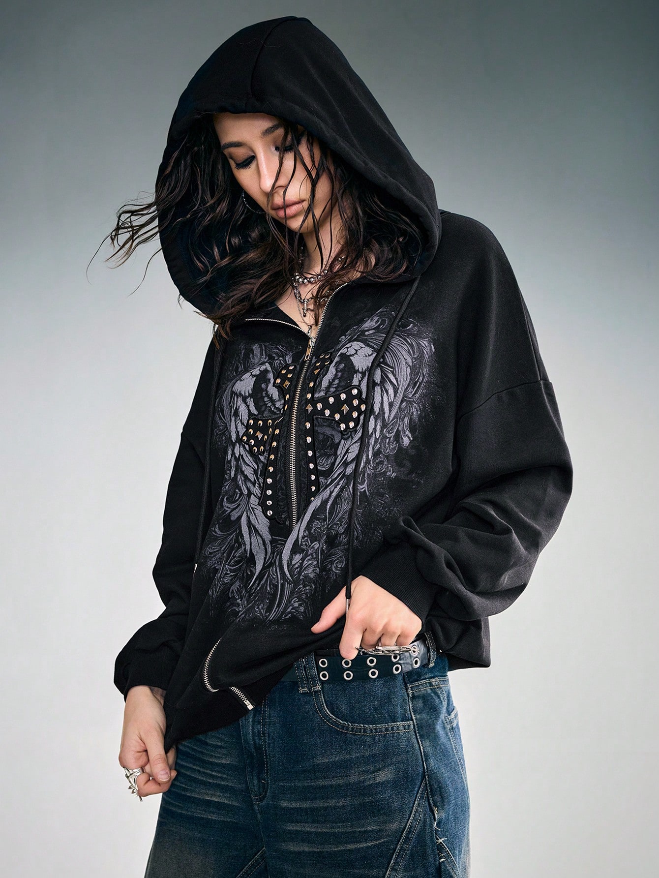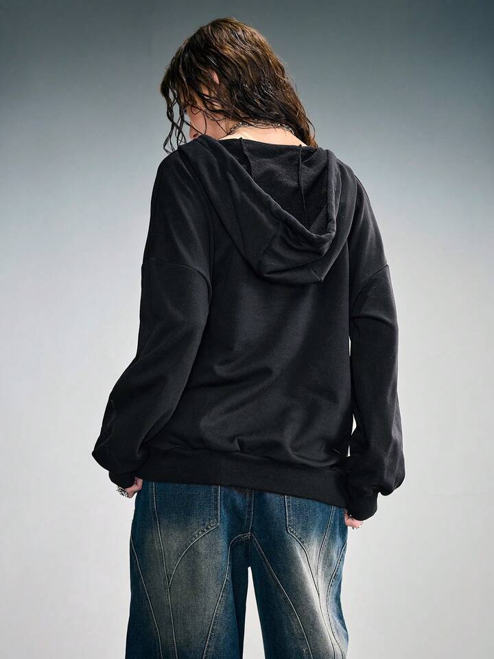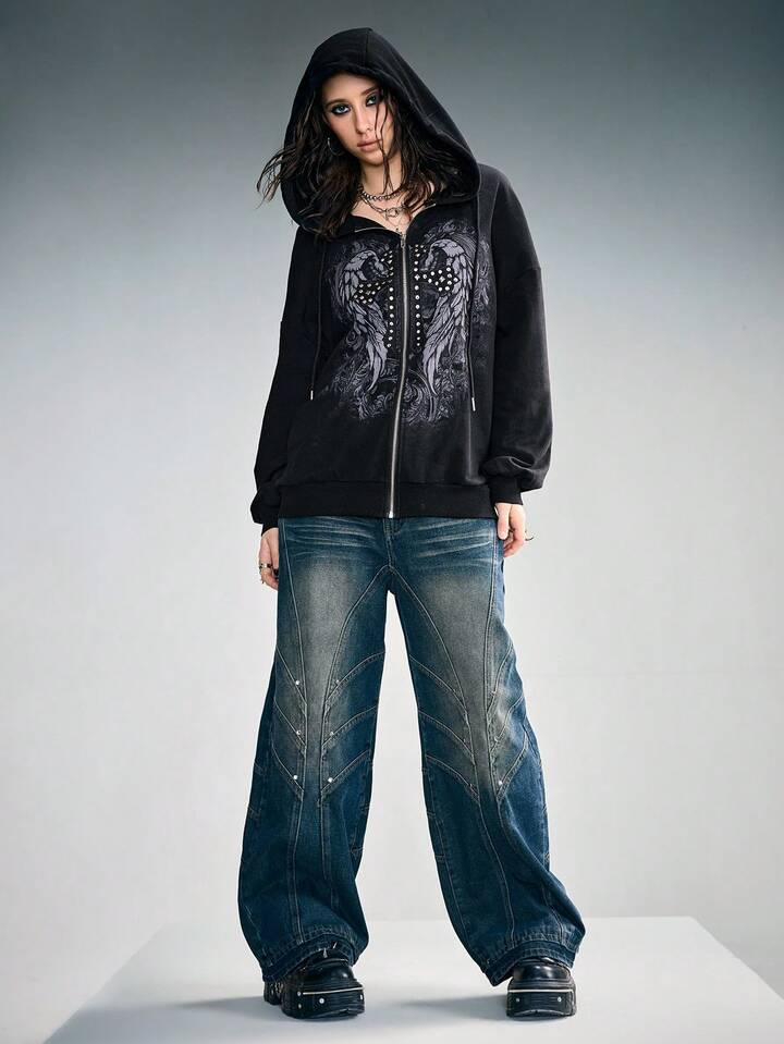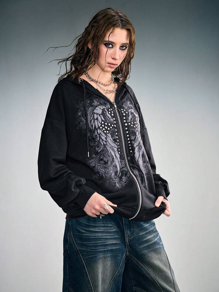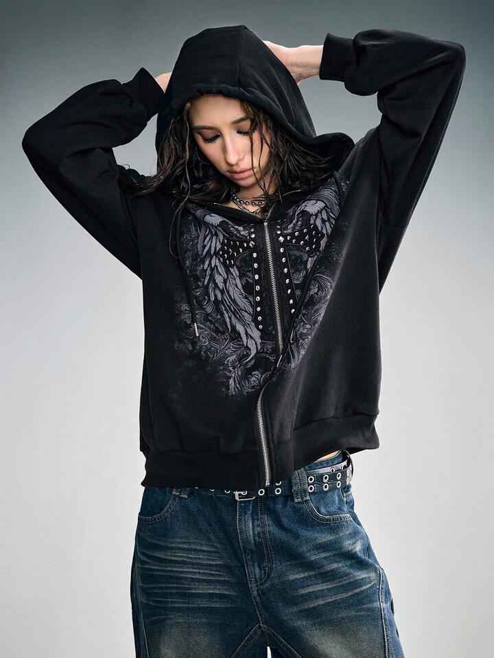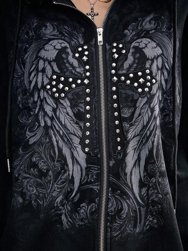 Grunge Punk Sudadera con capucha de forro polar con detalles de remaches, parche con estampado de letra y alas, estilo punk para mujer