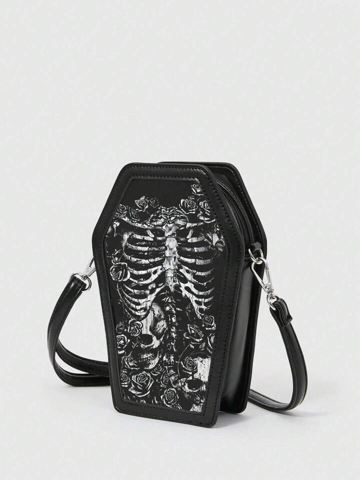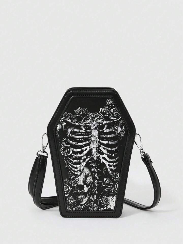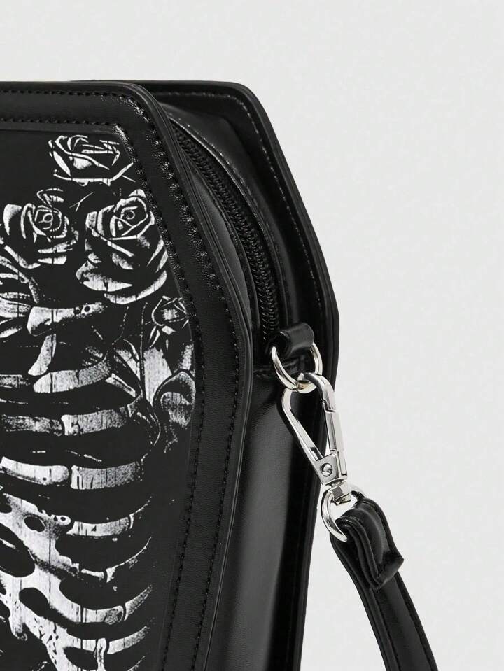 Grunge Punk Bolso de hombro con diseño de calavera, rosa y ataúd de estilo punk, bolso cruzado gótico Y2K para fiestas y viajes, Halloween
