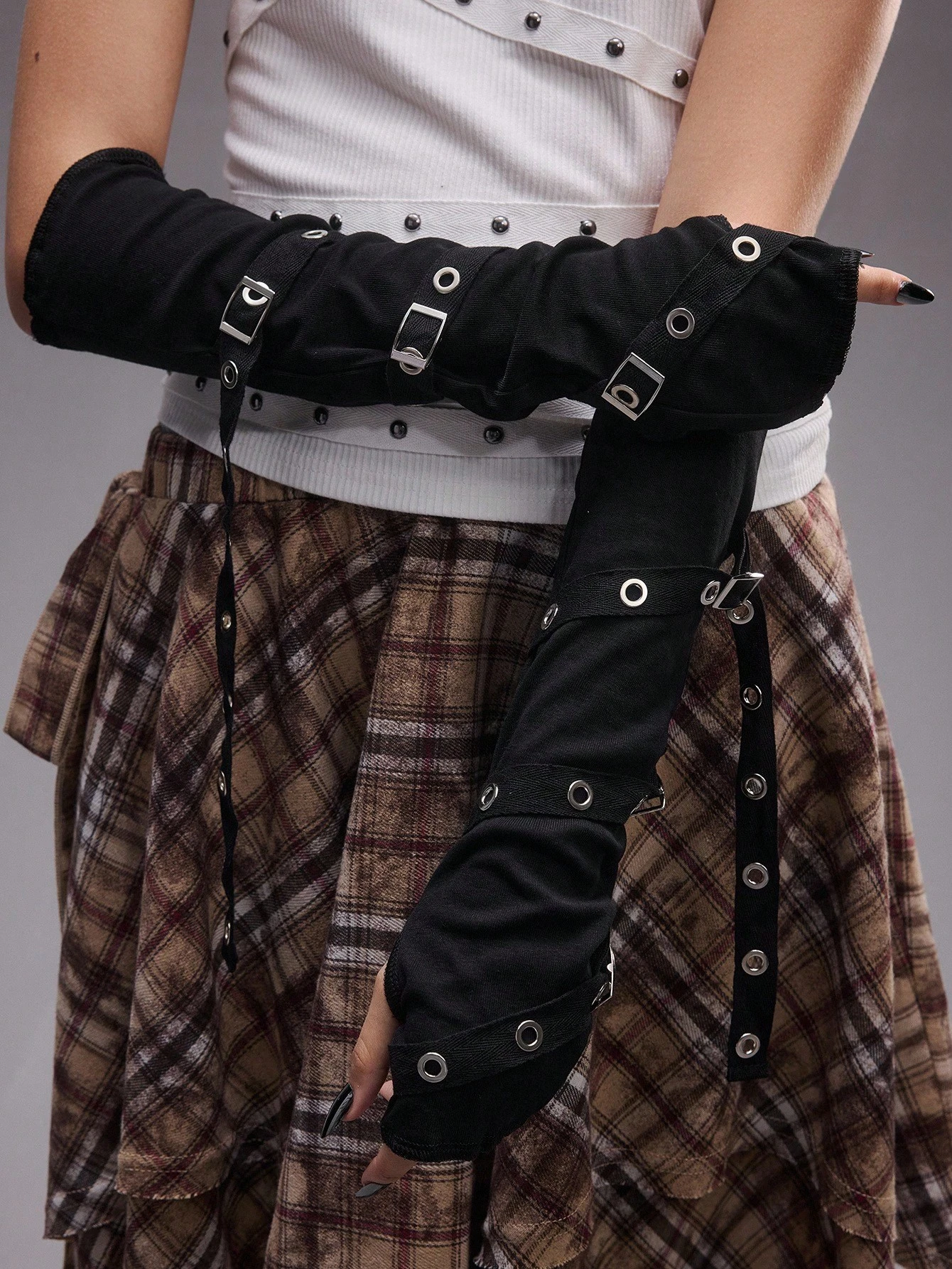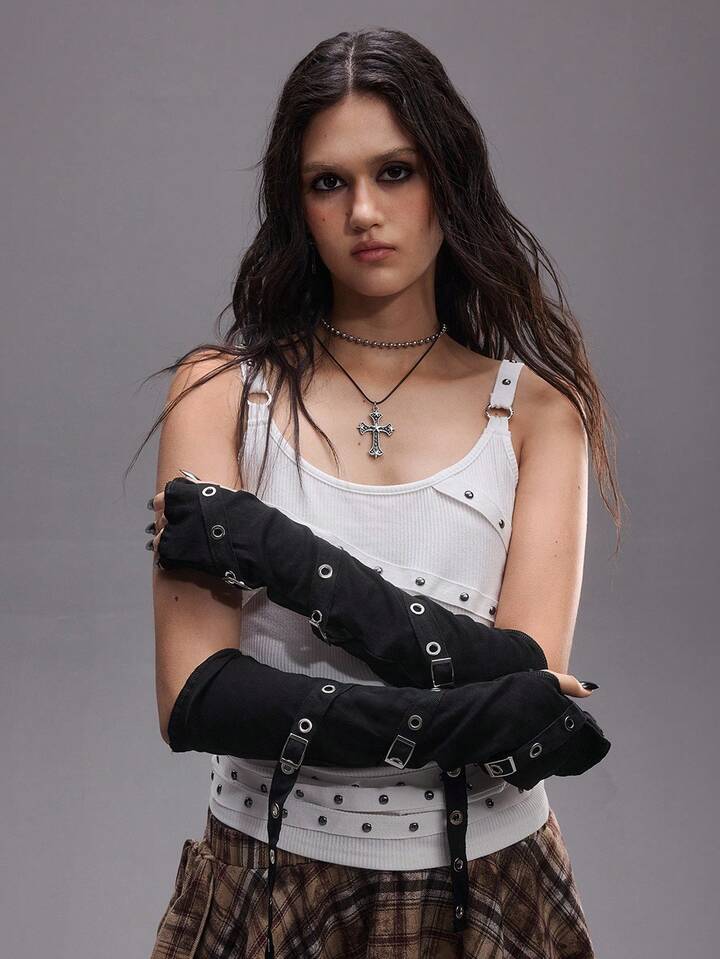 Grunge Punk Manga de brazo de media mano de protección solar con parches negros en estilo punk, decoración de ojetes metálicos, para uso en motocicleta, moda casual y unisex, adecuado para fiestas, reuniones sociales y vacaciones