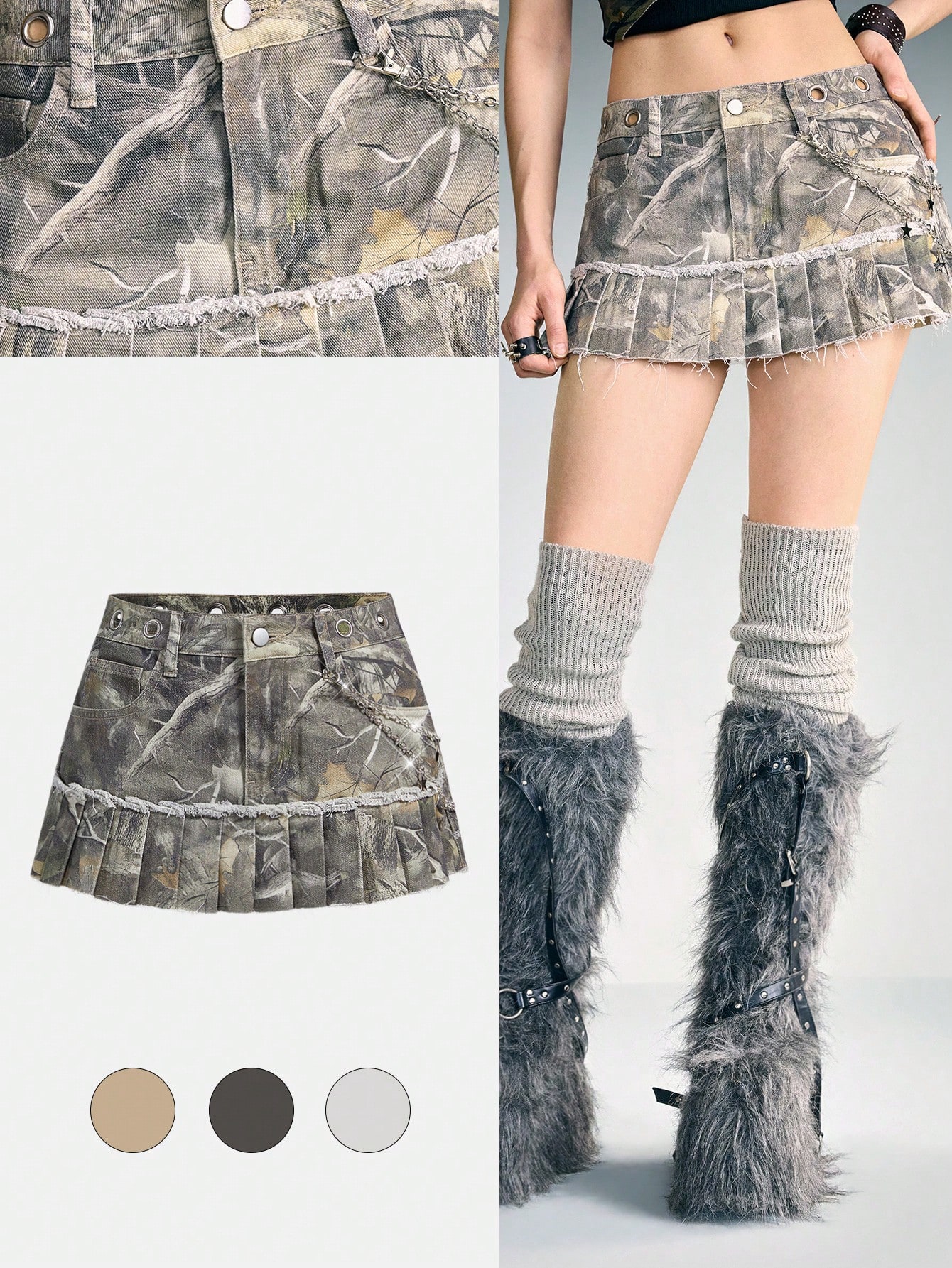 Grunge Punk Minifalda de mezclilla con estampado de hojas marchitas, cadena con ojetes metálicos y pliegues, estilo punk para mujer