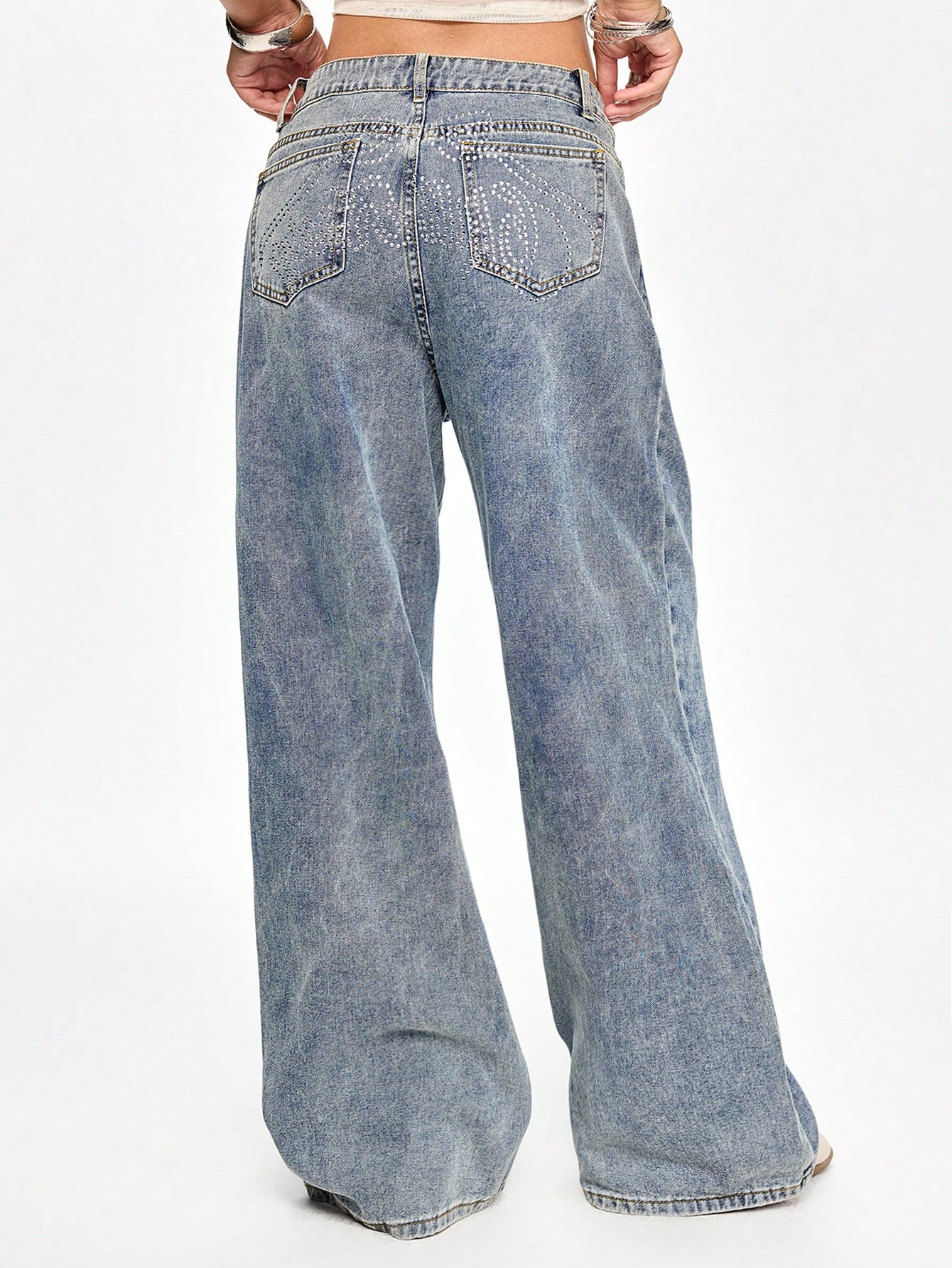 Grunge Punk Pantalones vaqueros acampanados con remiendo de strass de diseño de nicho americano retro, pantalones maxi brillantes y deslumbrantes para mujeres de moda
