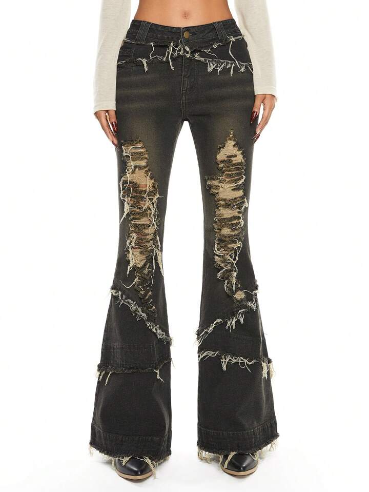 Grunge Punk Jeans acampanados con dobladillo deshilachado y desgastado con efecto vintage para mujer, para otoño/invierno