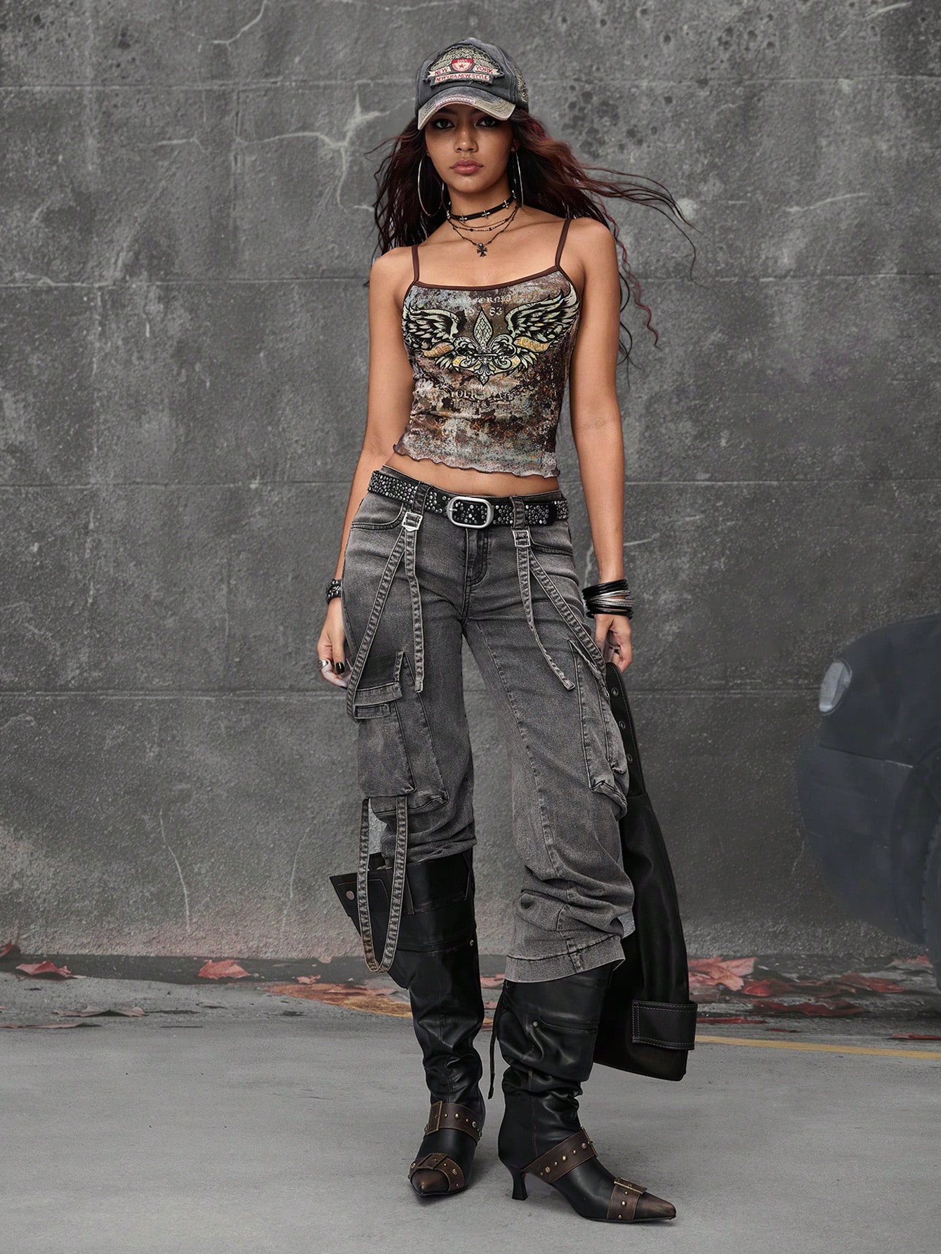 Grunge Punk Camiseta de tirantes ajustada tipo body con estampado retro vintage de alas desgastado
