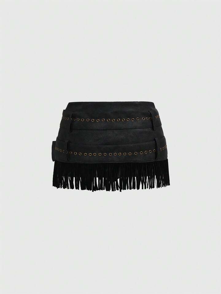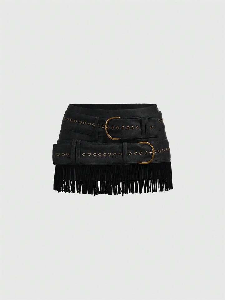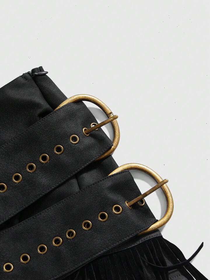 Grunge Punk Minifalda de PU con diseño de flecos retro y desgastada, de talle bajo, adecuada para atuendos de festivales de música