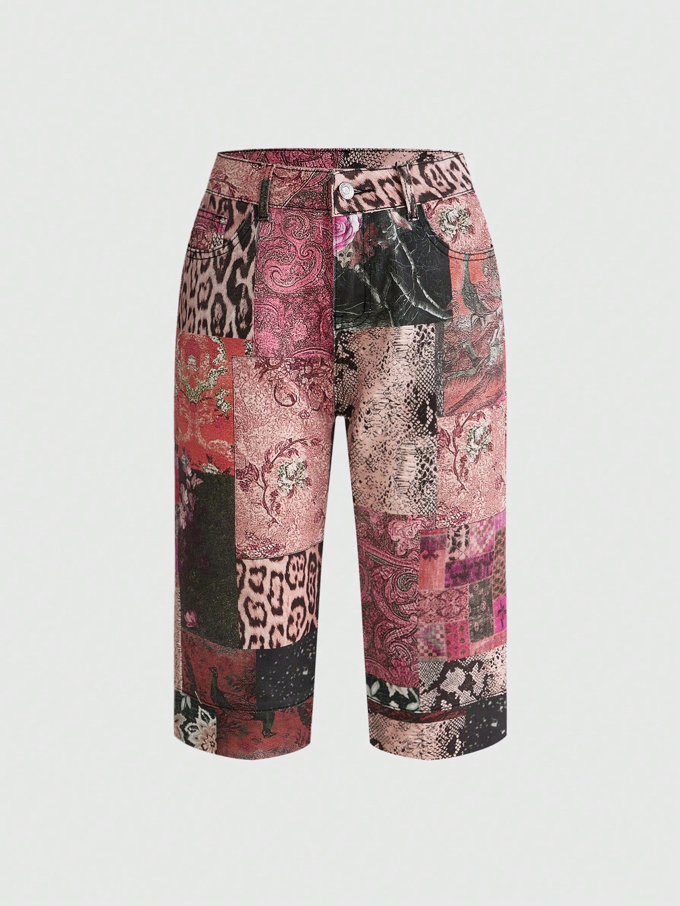 Grunge Punk Pantalones cortos de mezclilla ajustados con estampado retro de leopardo y floral, estilo Y2K
