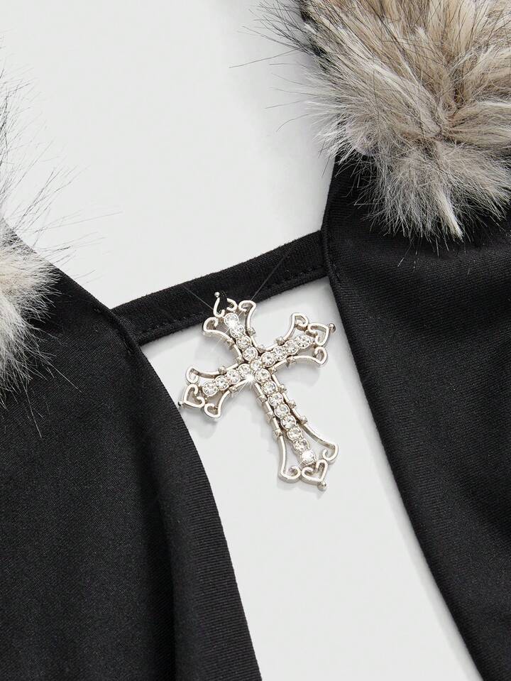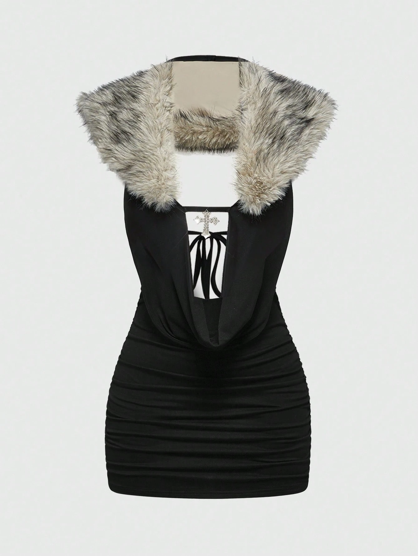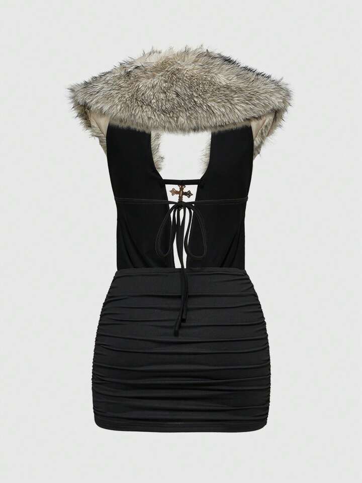 Grunge Punk Vestido mini con escote profundo en V, cuello de halter con colgante cruzado y cintura con lazo para mujeres