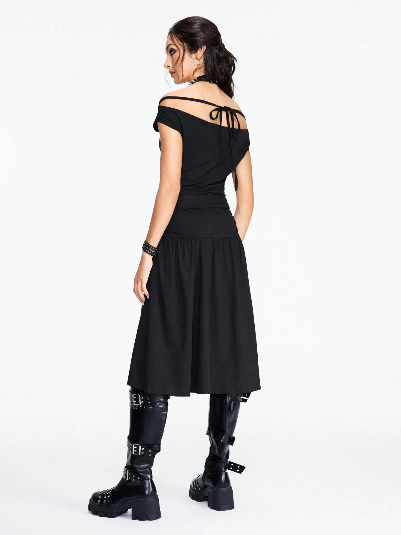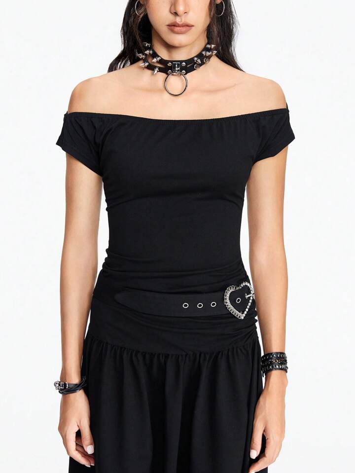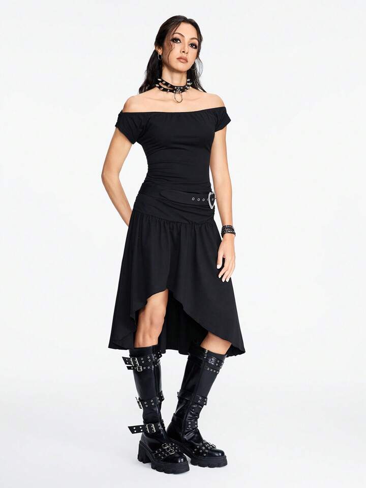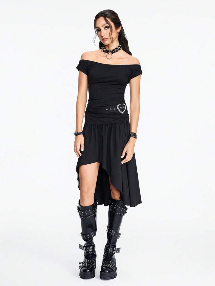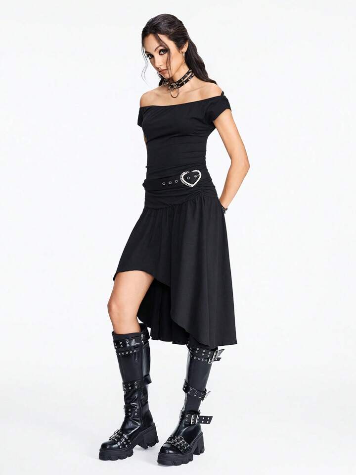 Grunge Punk Vestido de mujer de línea A ajustado con hombros descubiertos, espalda descubierta, cuello drapeado, bajo asimétrico, adorno de rhinestones en forma de corazón en la cintura y cinturón