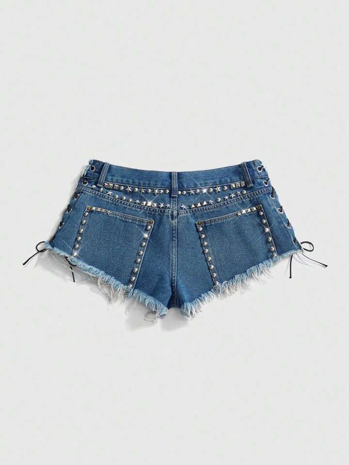 Grunge Punk Shorts vaqueros cortos desgastados de cintura baja para mujer con cordones, remaches y encaje vintage sexy para festivales de música