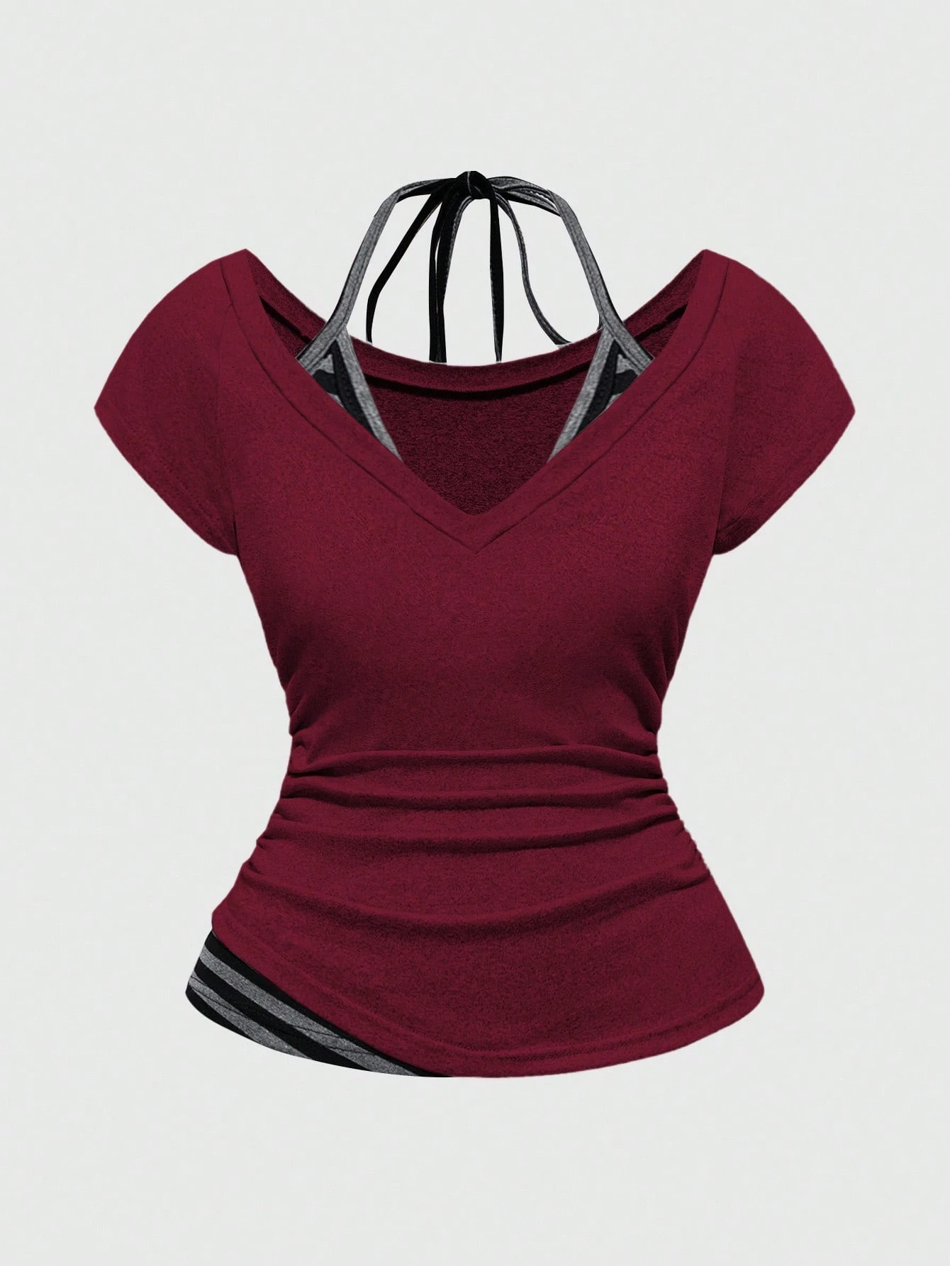 Grunge Punk Camiseta de mujer con cuello en V, a rayas y contraste de color, con lazo halter, color vino tinto, estilo sexy Y2K 2 en 1