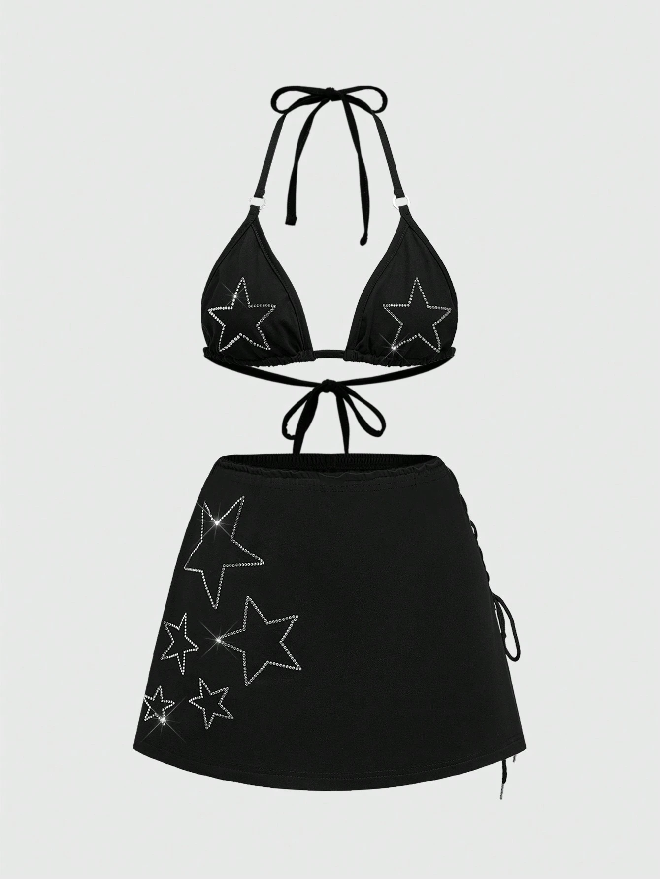 Grunge Punk Conjunto de 2 piezas de top corto sin mangas con escote halter y lazo, y falda de cintura baja con estilo vintage de celebridad Y2K con adornos de strass en forma de estrella y encaje para mujer