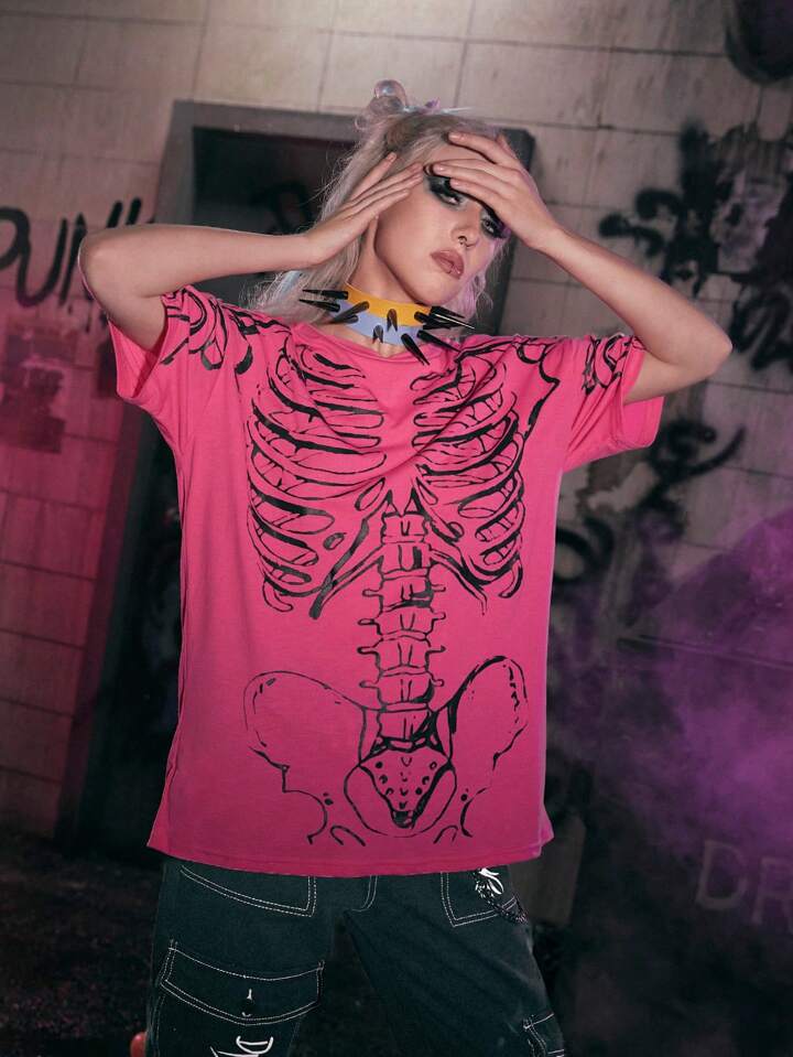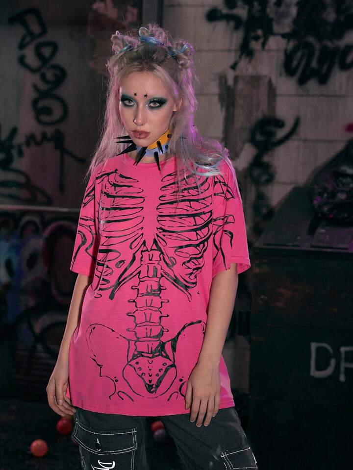 Grunge Punk Camiseta de hombros caídos estampado de esqueleto
