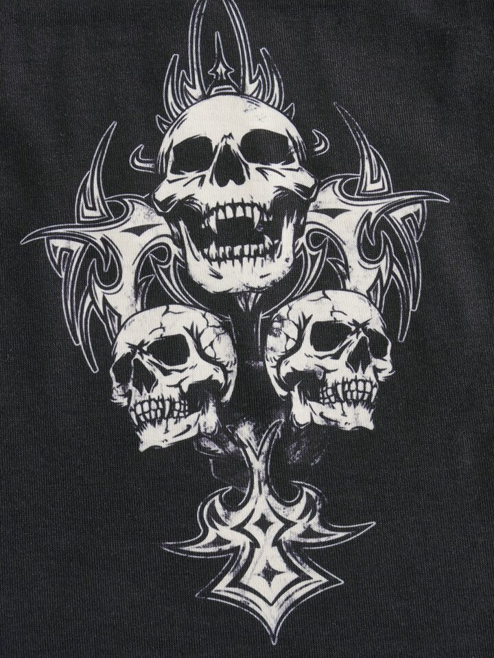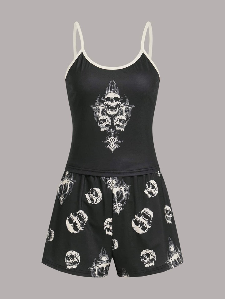 Grunge Punk Conjunto de pijama con estampado de calavera y ribete contrastante, para la escuela