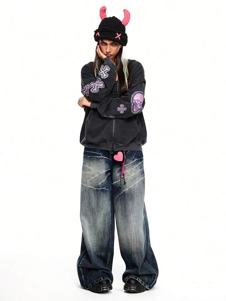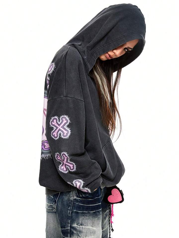 Grunge Punk Sudadera con capucha holgada con estampado de calavera y bordes deshilachados para mujeres