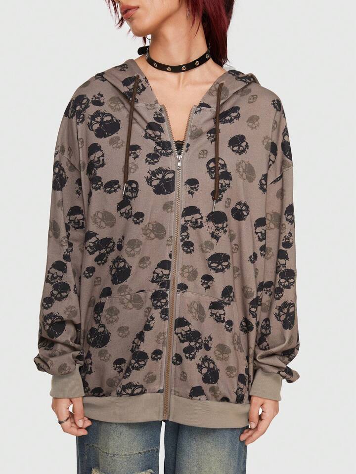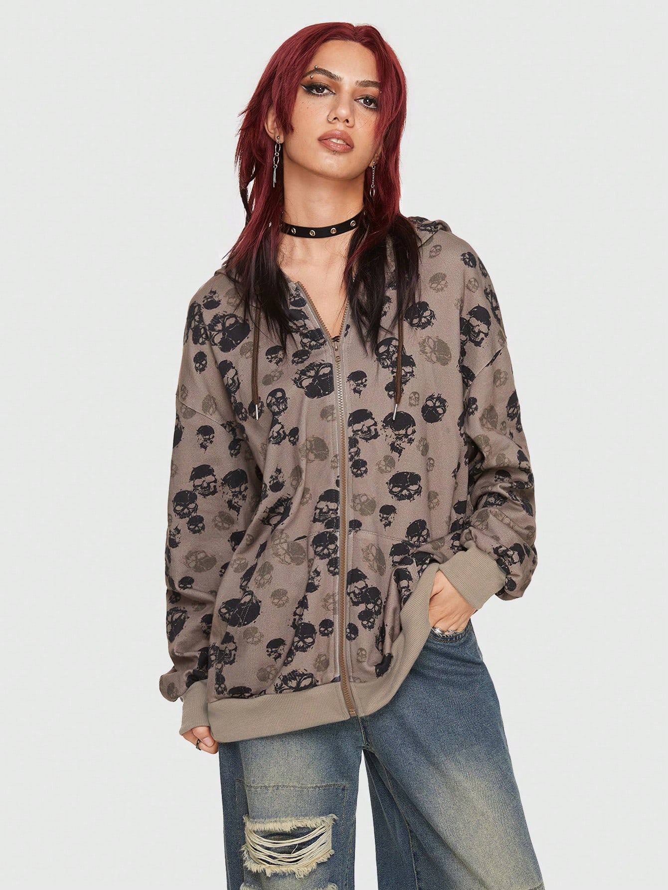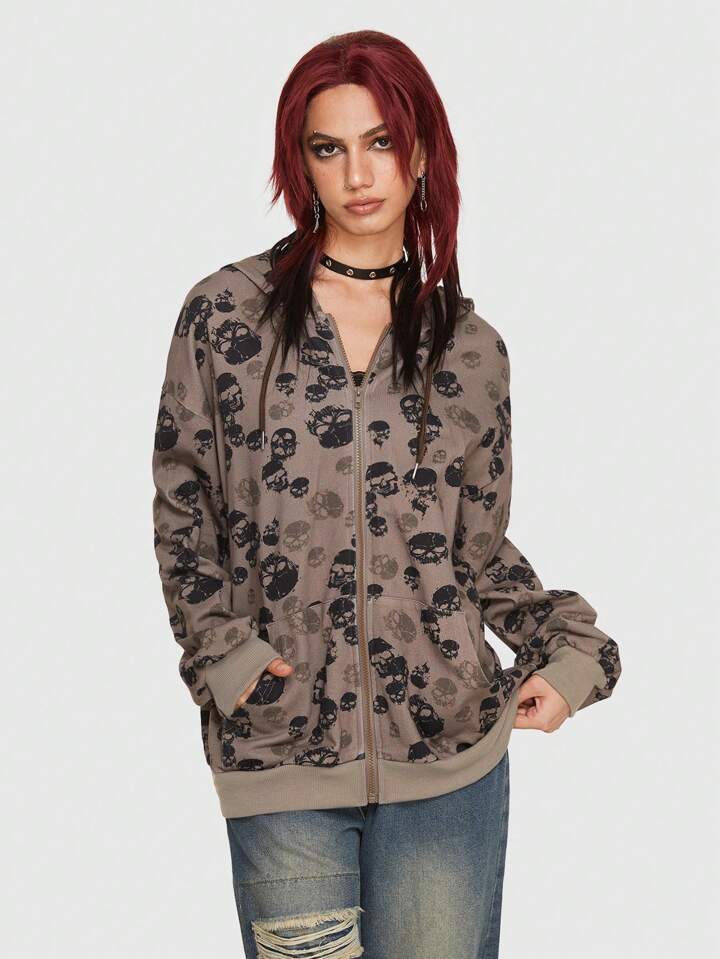 Grunge Punk Capucha con cremallera estampado de cráneo