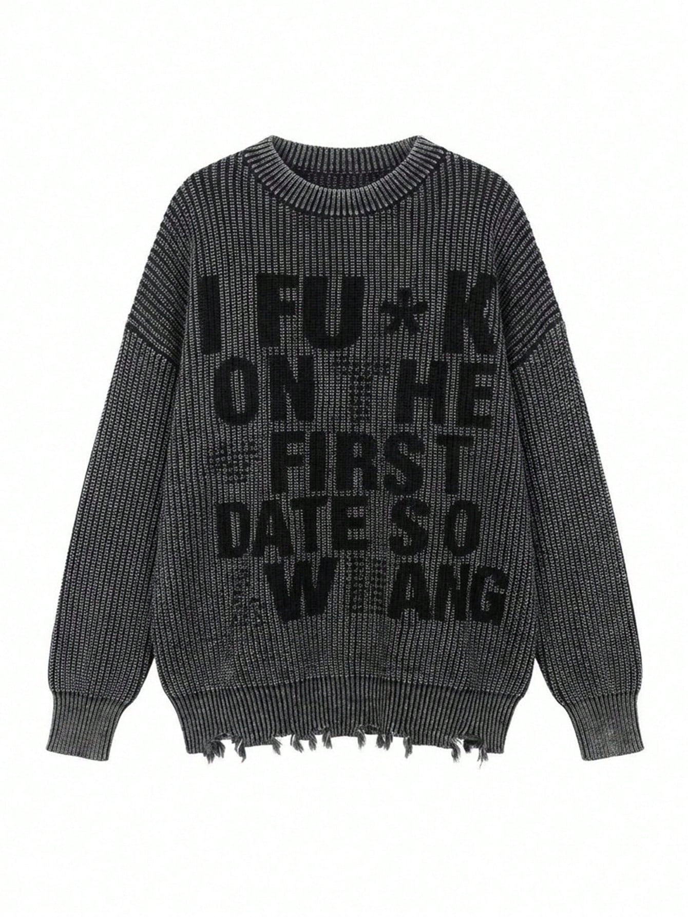 Grunge Punk Suéter holgado de punto grueso lavado con estampado de letras grandes, remaches y hombros caídos para mujer