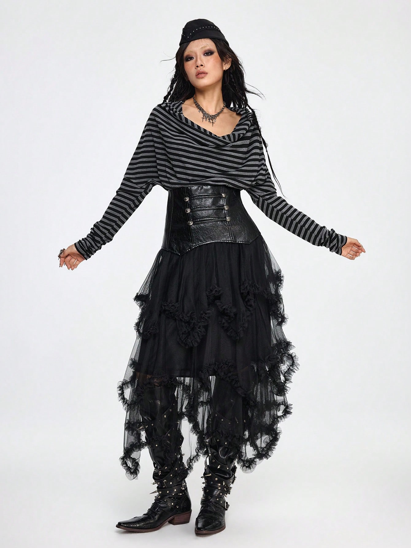 Grunge Punk Camiseta ajustada con parches de rayas negras y grises de estilo náutico punk retro