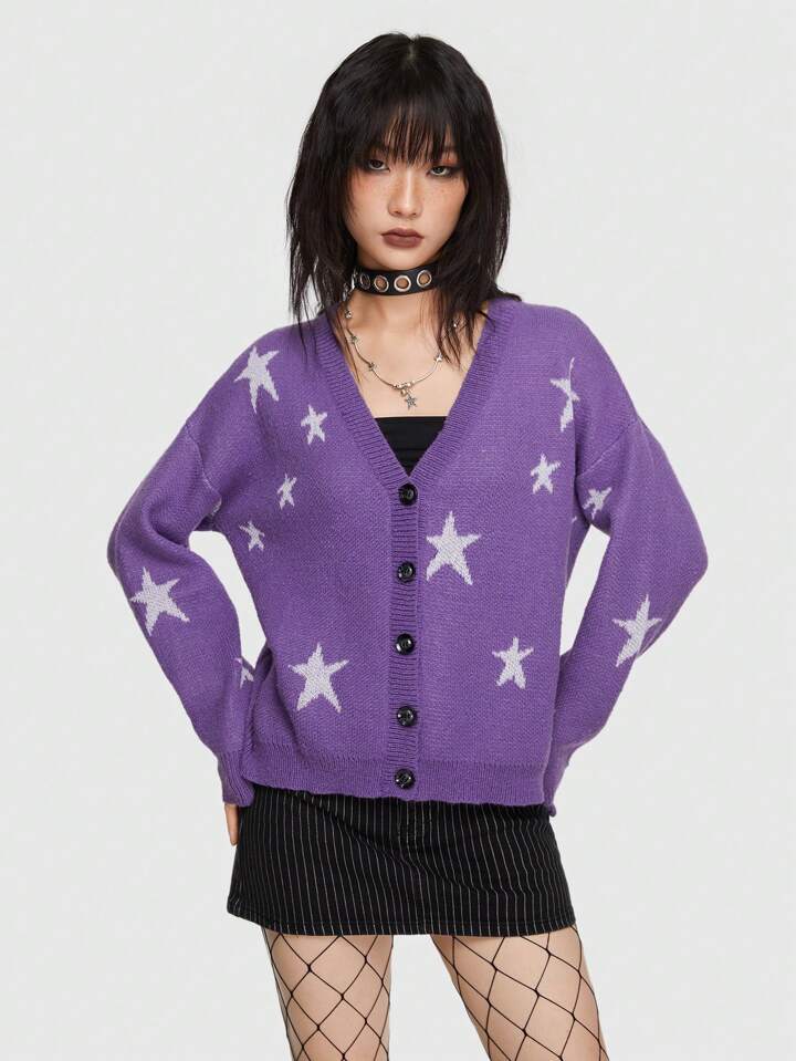 Grunge Punk Cárdigan con patrón de estrella de hombros caídos