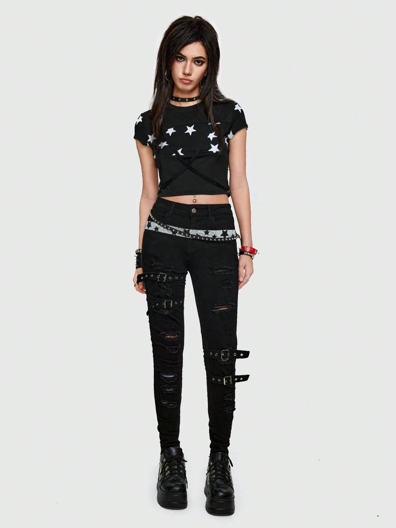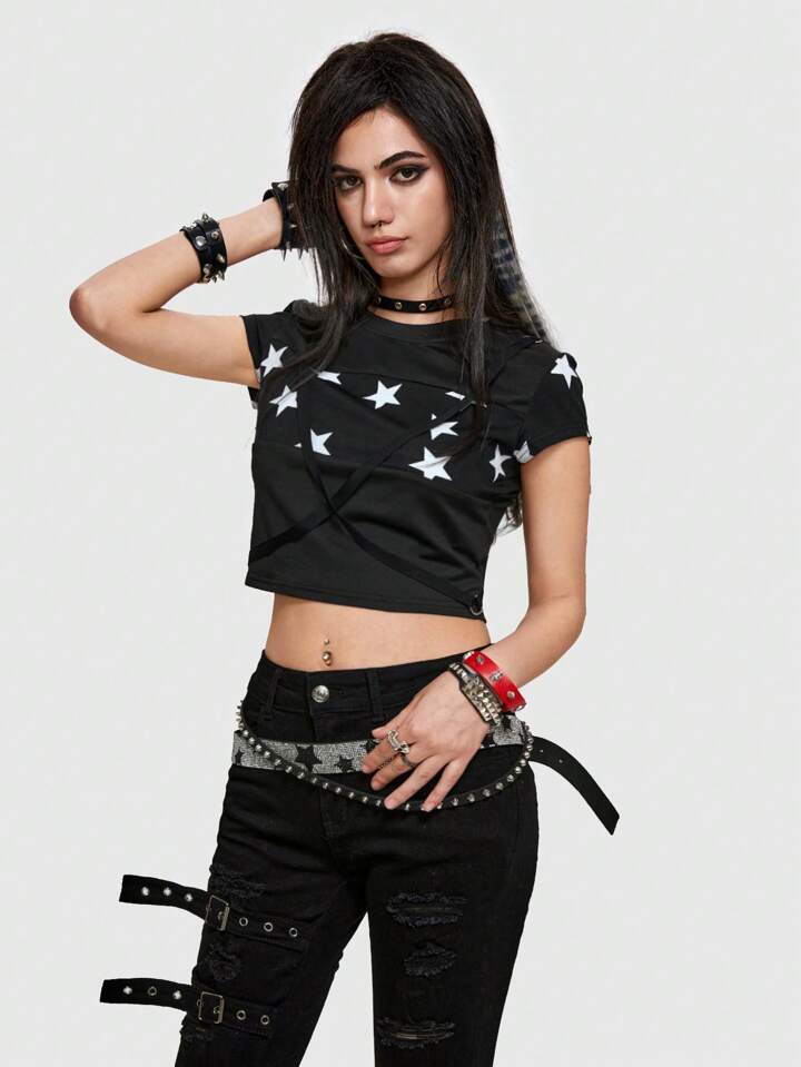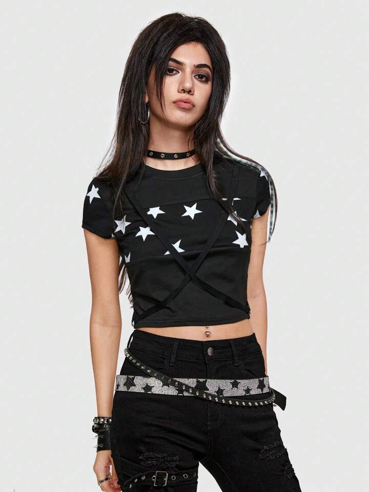 Grunge Punk Camiseta crop con estampado de estrella con tira cruzada