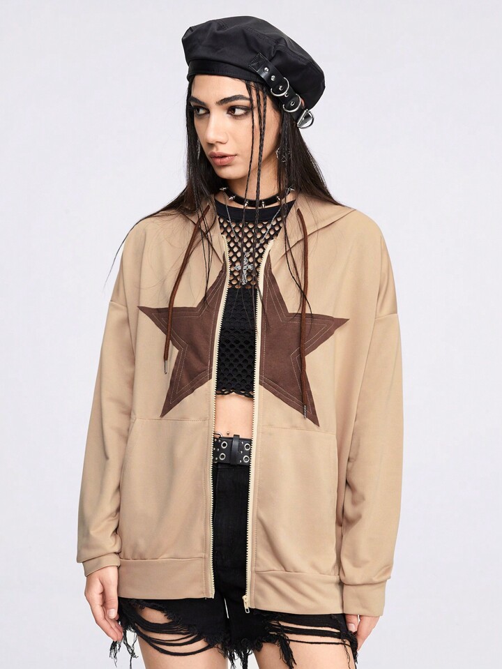 Grunge Punk Capucha con estampado de estrella de hombros caídos con cremallera con cordón
