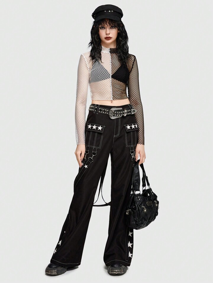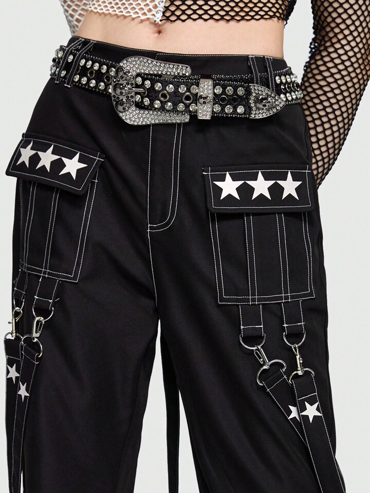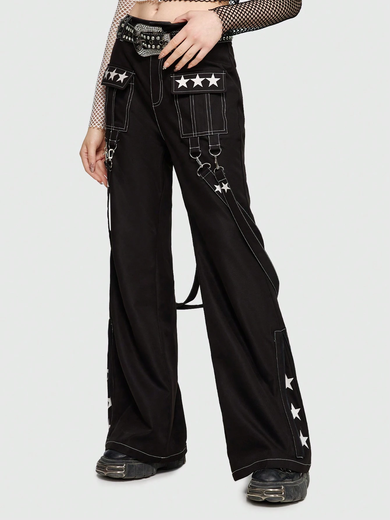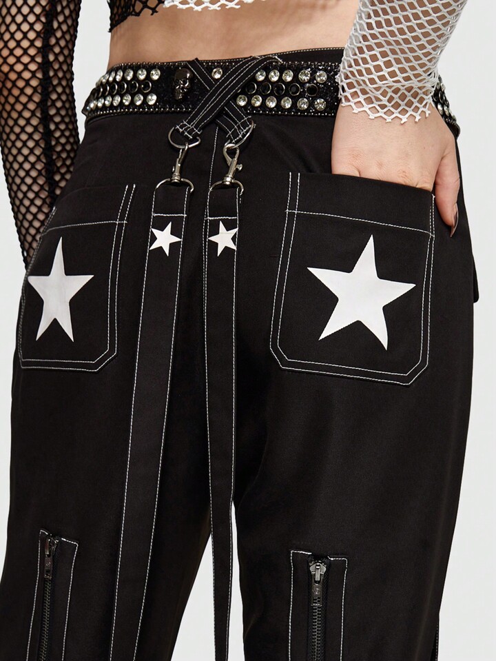 Grunge Punk Pantalones acampanados con estampado de estrella con diseño de cremallera tirantes
