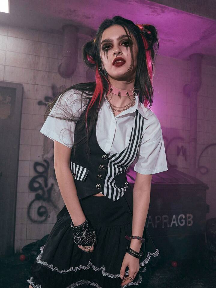 Grunge Punk Top halter de rayas con botón delantero sin camisa