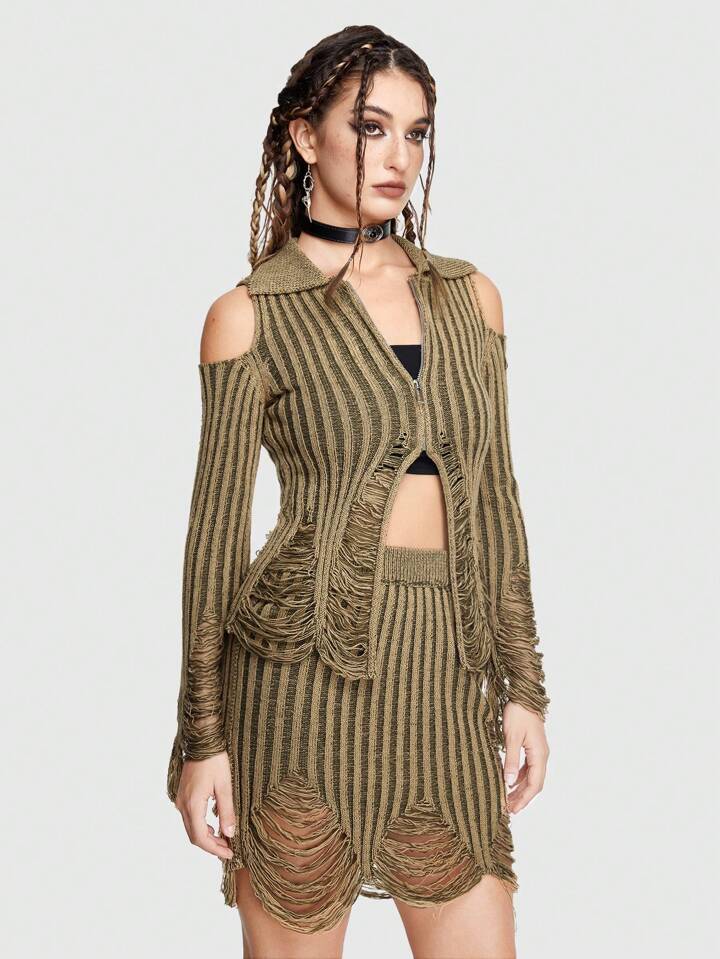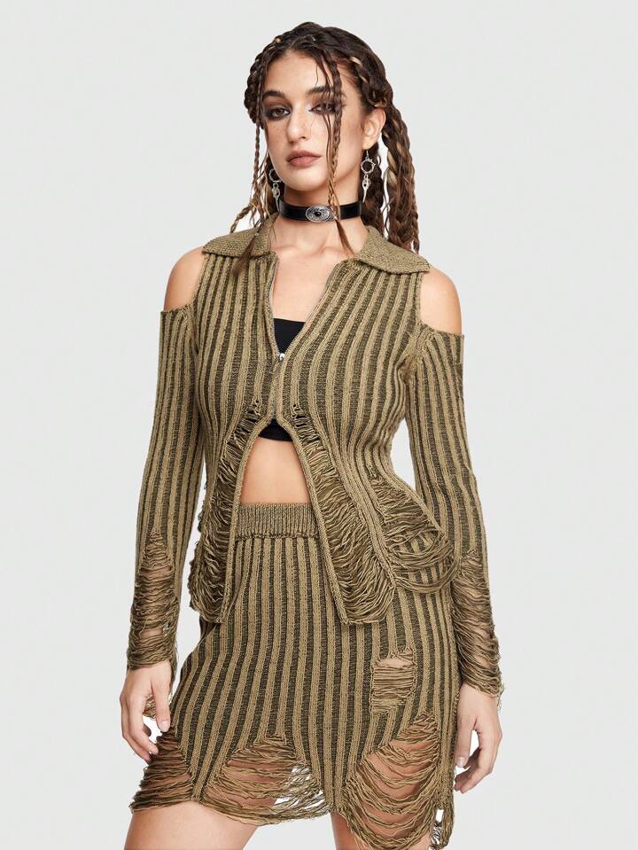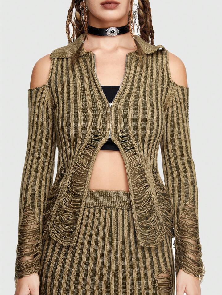 Grunge Punk Cárdigan con patrón de rayas de hombros descubiertos roto