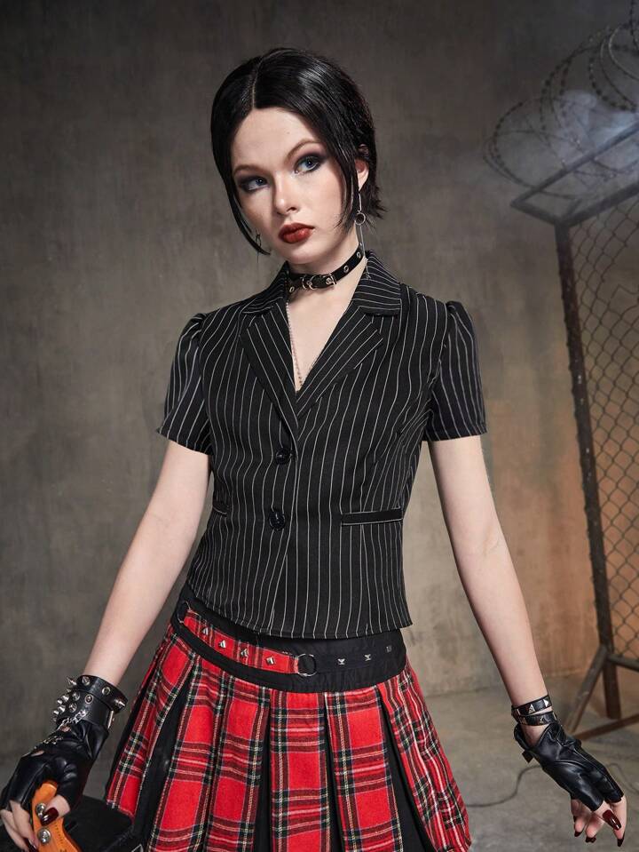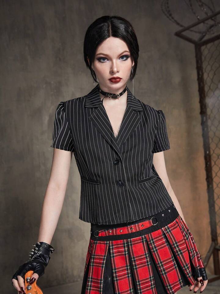 Grunge Punk Camisa con estampado de rayas de cuello con solapa