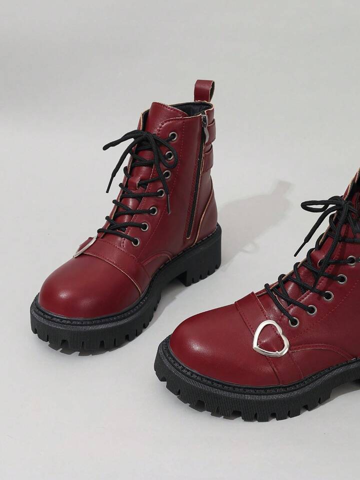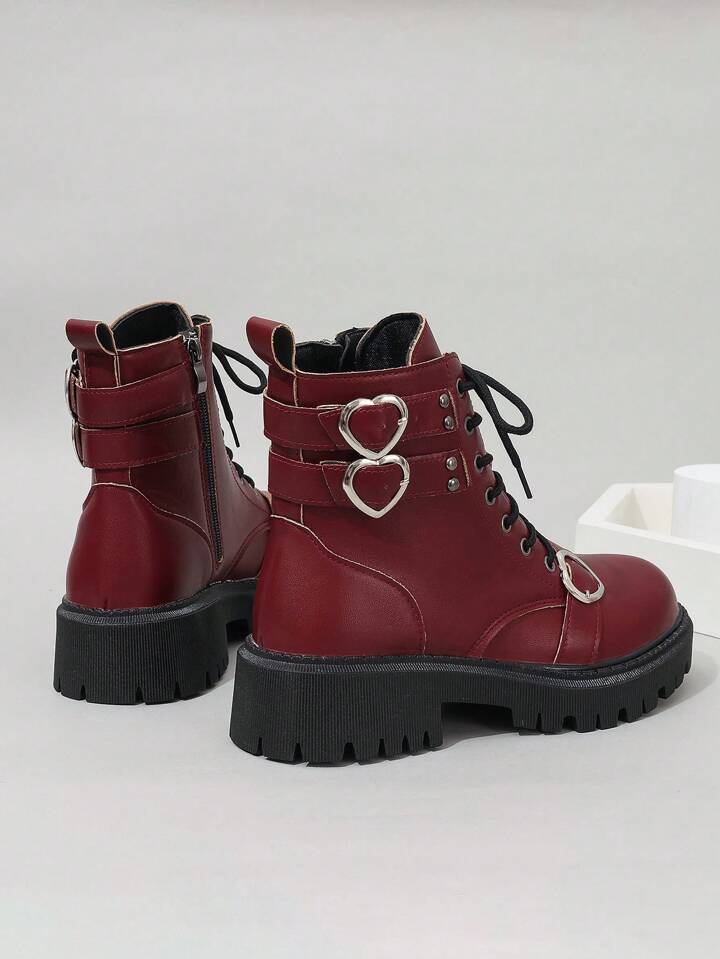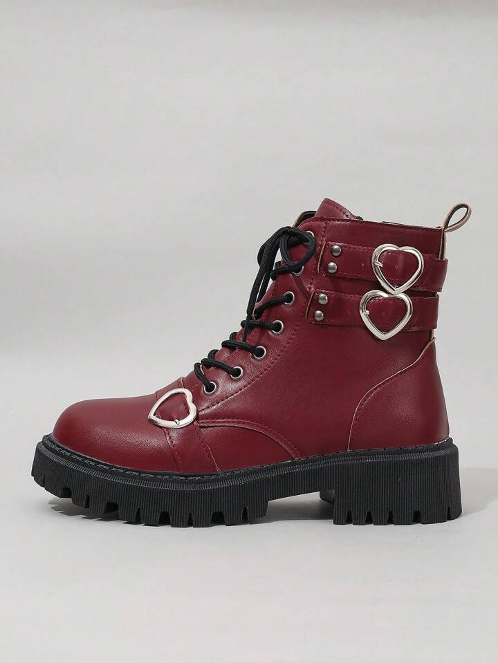 Grunge Punk Botas de tobillo con decoración de corazón con tachuelas estilo punk, color vino tinto, botas cortas de moda, estilo universitario para mujeres, botas de otoño y primavera color BURDEOS