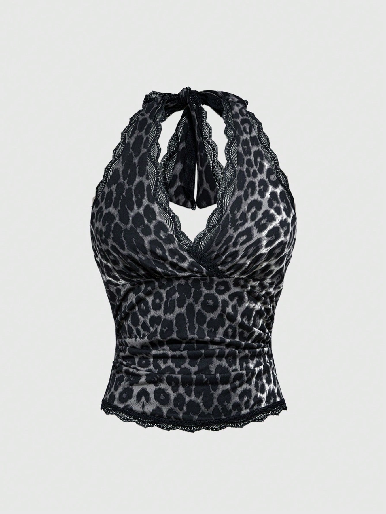 Grunge Punk Top de tirantes de mujer con estampado de leopardo y encaje, estilo de moda veraniego Y2K