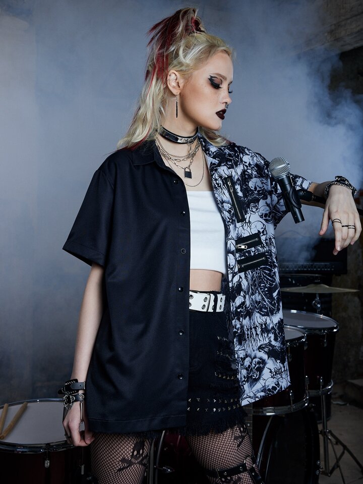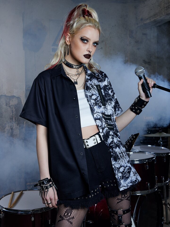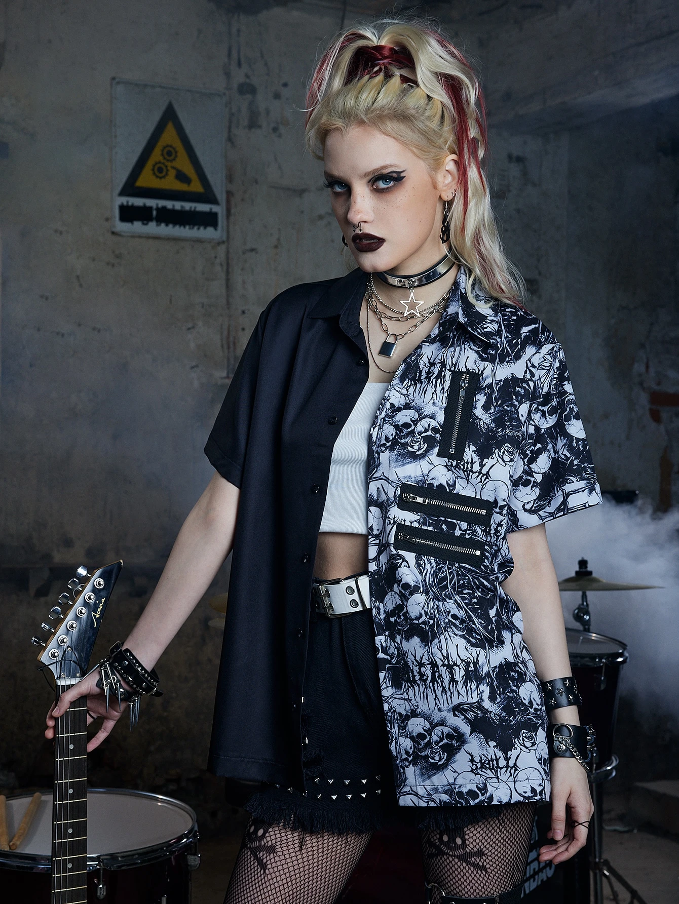 Grunge Punk Camisa de dos tonos con estampado de cráneo