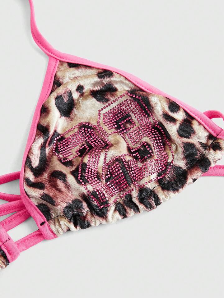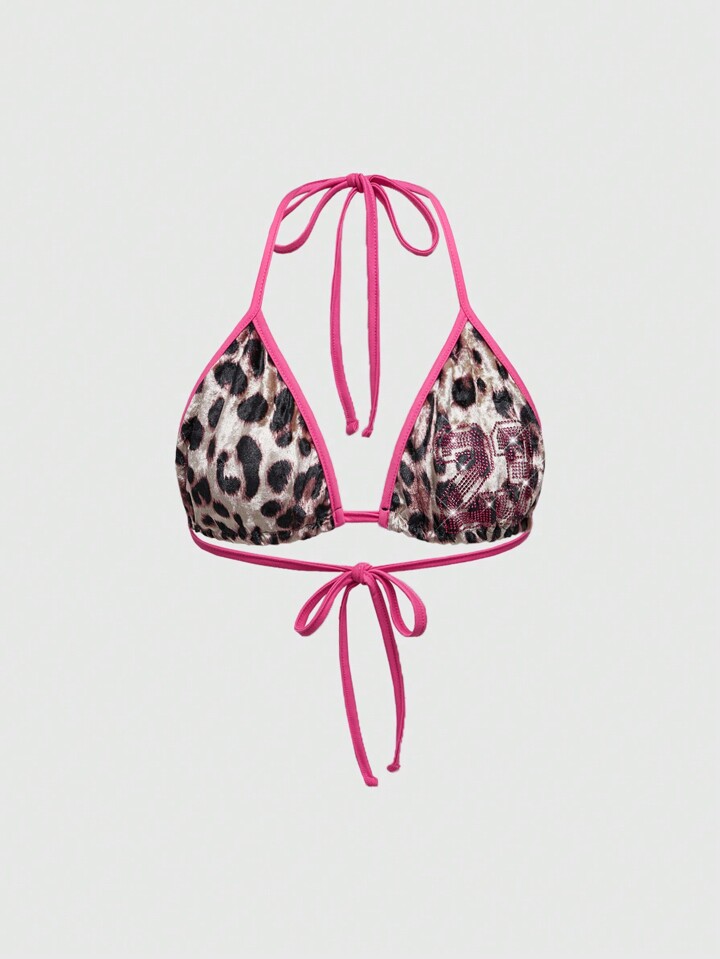 Grunge Punk Top de bikini para mujer con estampado de leopardo de terciopelo vintage Y2K, diseño de apliques y cristales en forma de letra para el Día de San Valentín