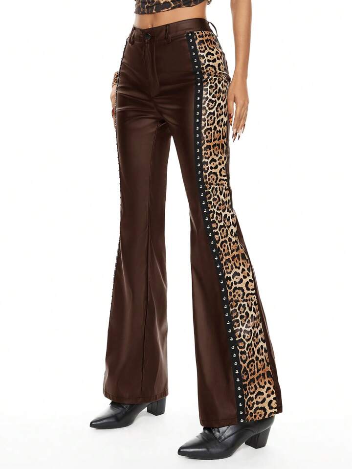 Grunge Punk Pantalones acampanados de piel sintética PU de tiro bajo con diseño acolchado estampado de leopardo, remaches y estilo Y2K para el Día de San Valentín