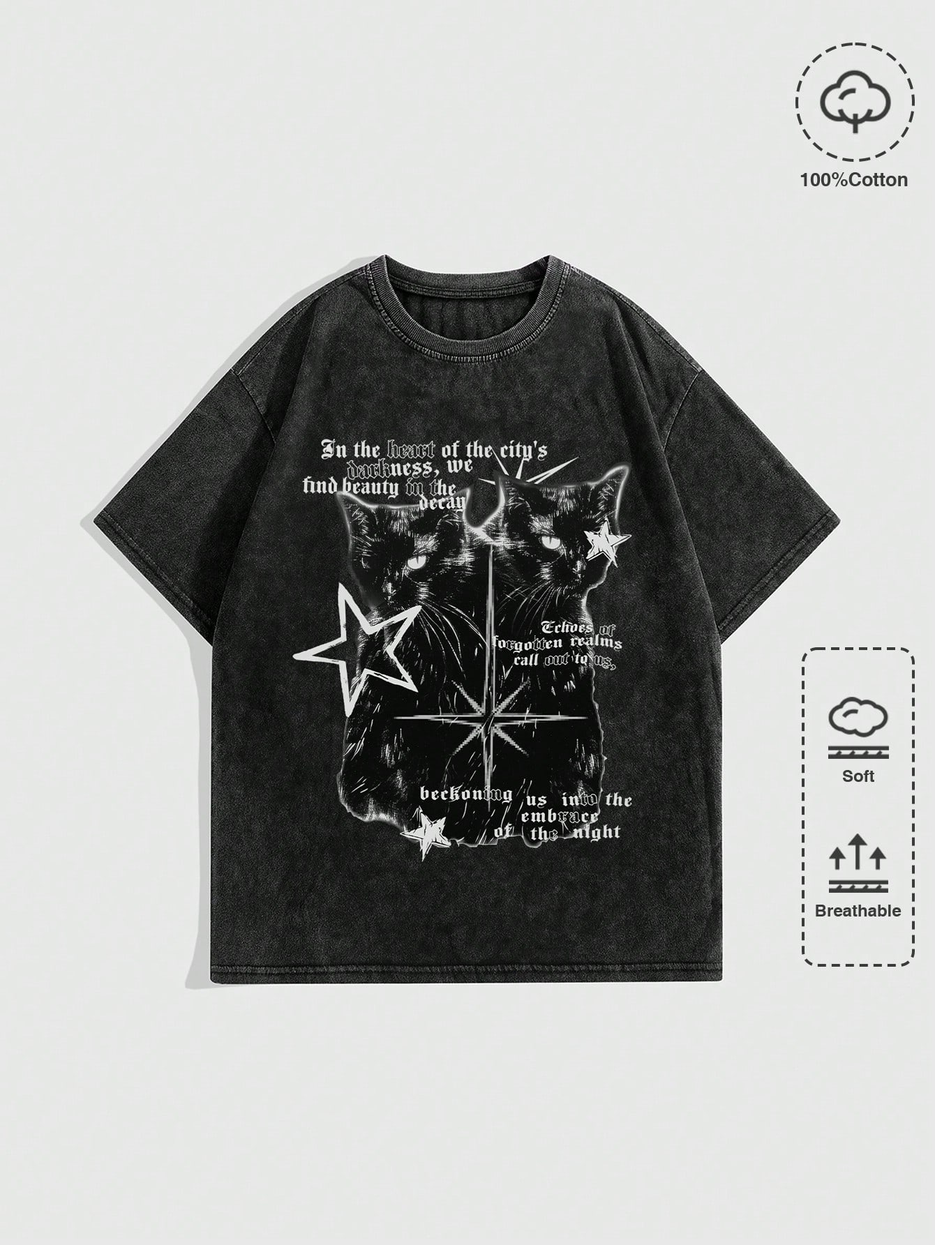 Grunge Punk Camiseta holgada de algodón lavado con cuello redondo de manga corta, con estampado gráfico de lema de araña desgastado vintage, estilo unisex streetwear para festival de música, estilo rock oscuro