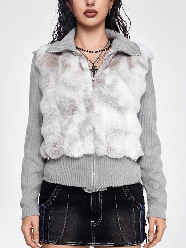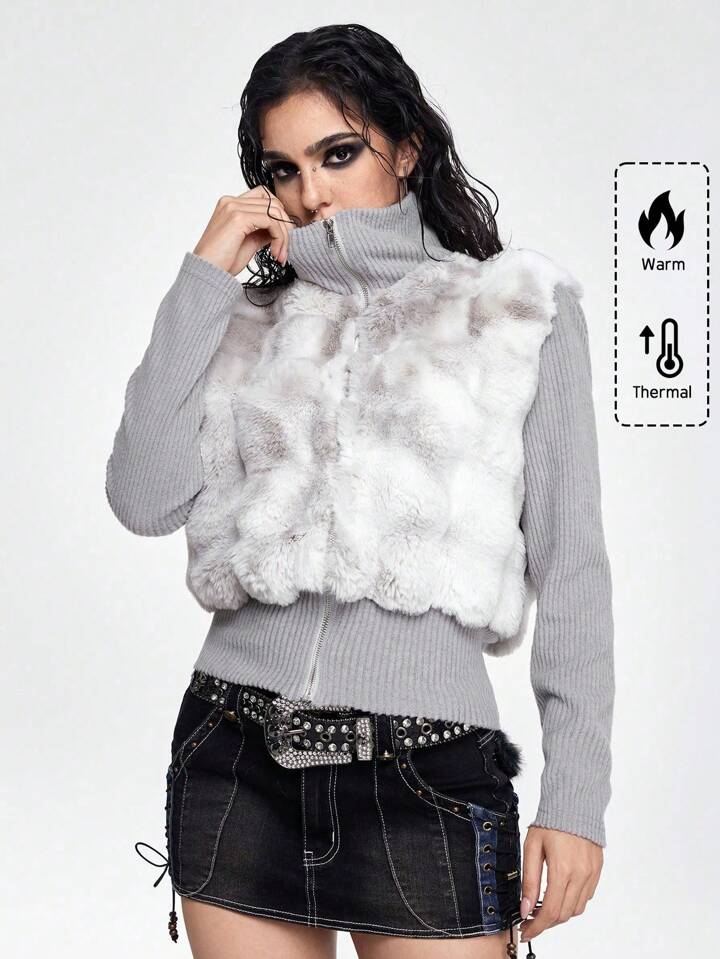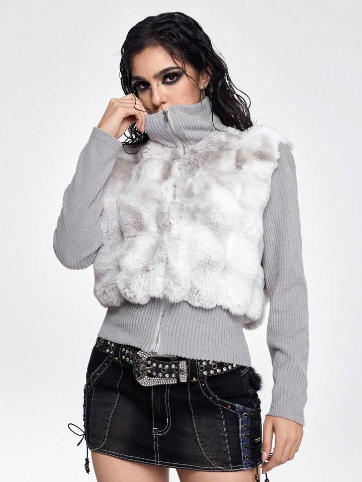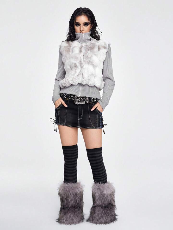 Grunge Punk Conjunto vintage de nieve con suéter de parchwork acanalado de piel sintética