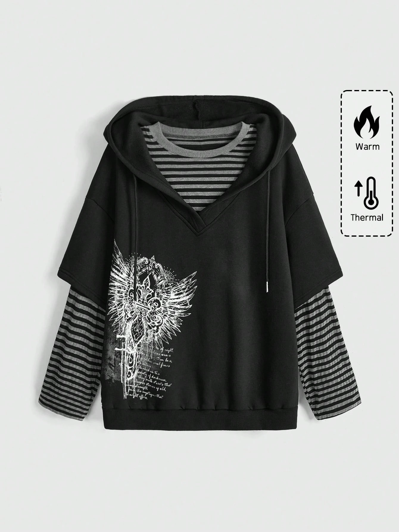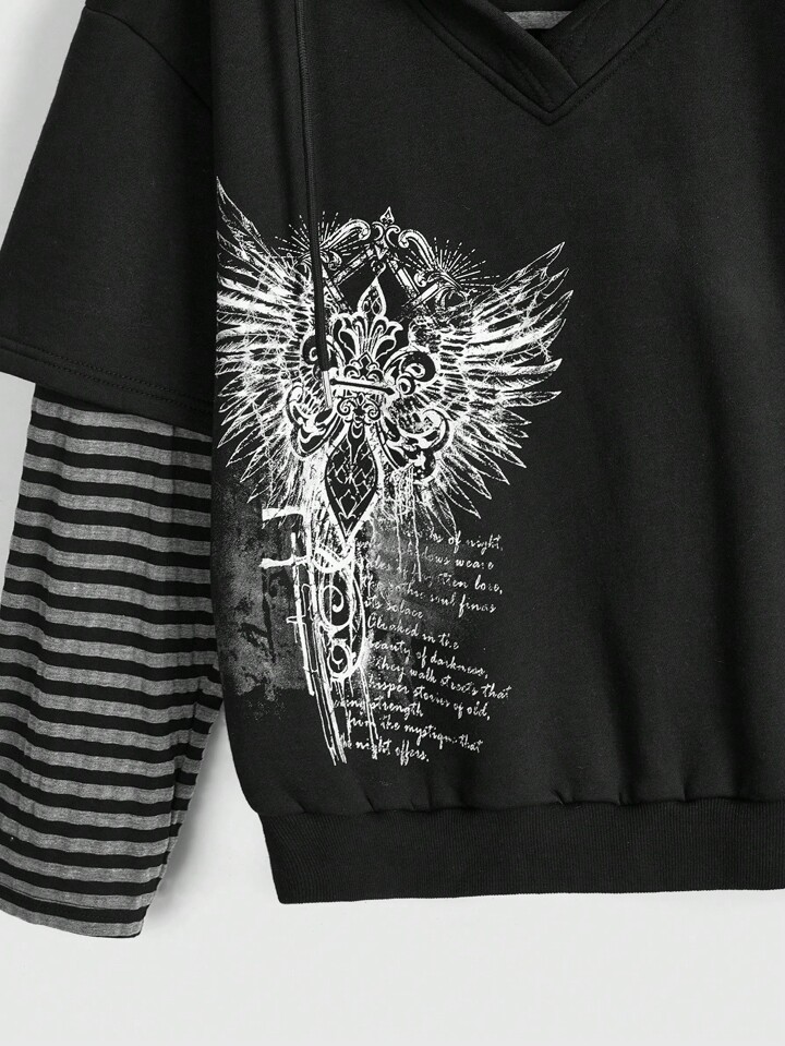 Grunge Punk Sudadera oversize vintage desgastada con estampado parchwork de rayas, lema de cruz y efecto desgastado para uso casual y streetwear