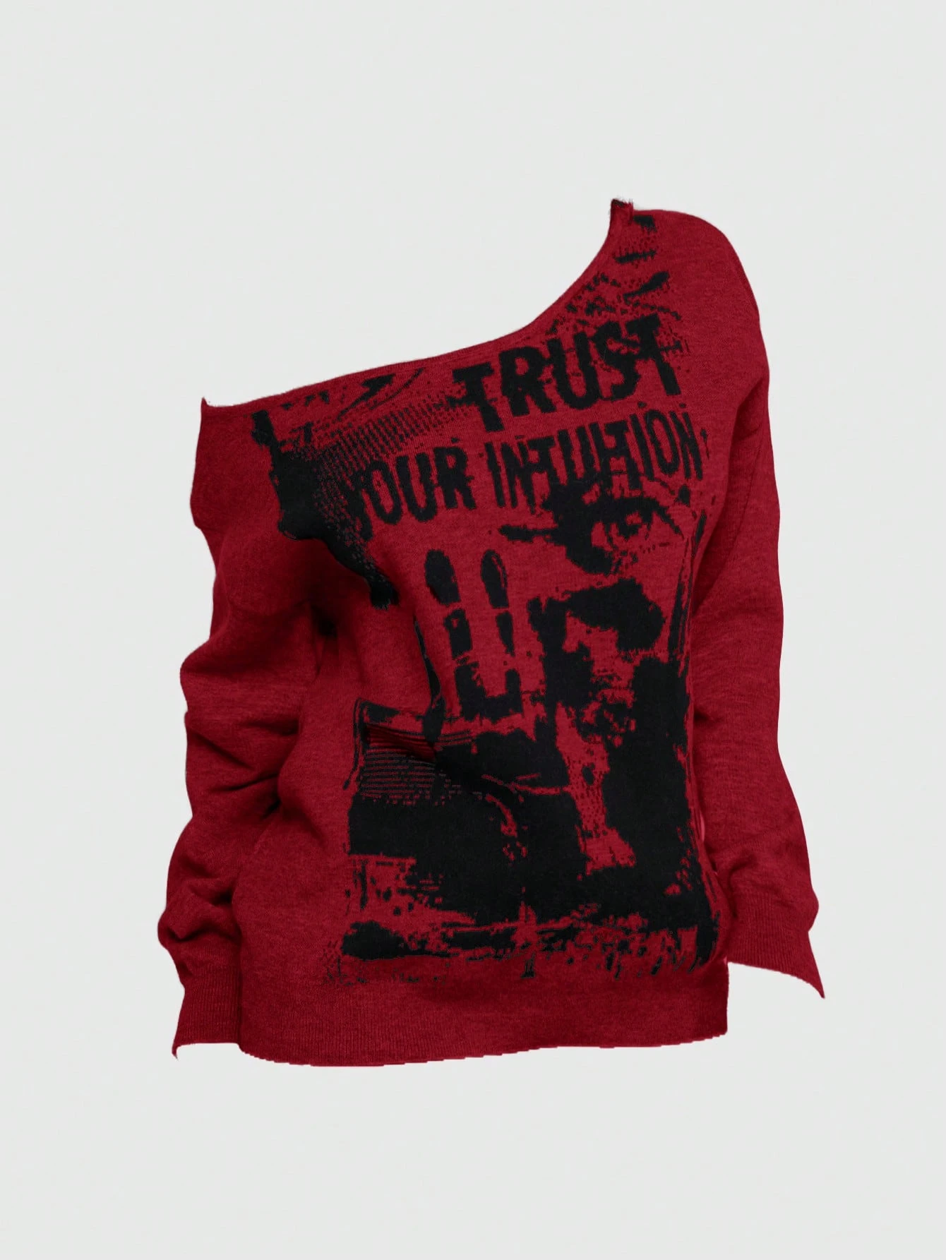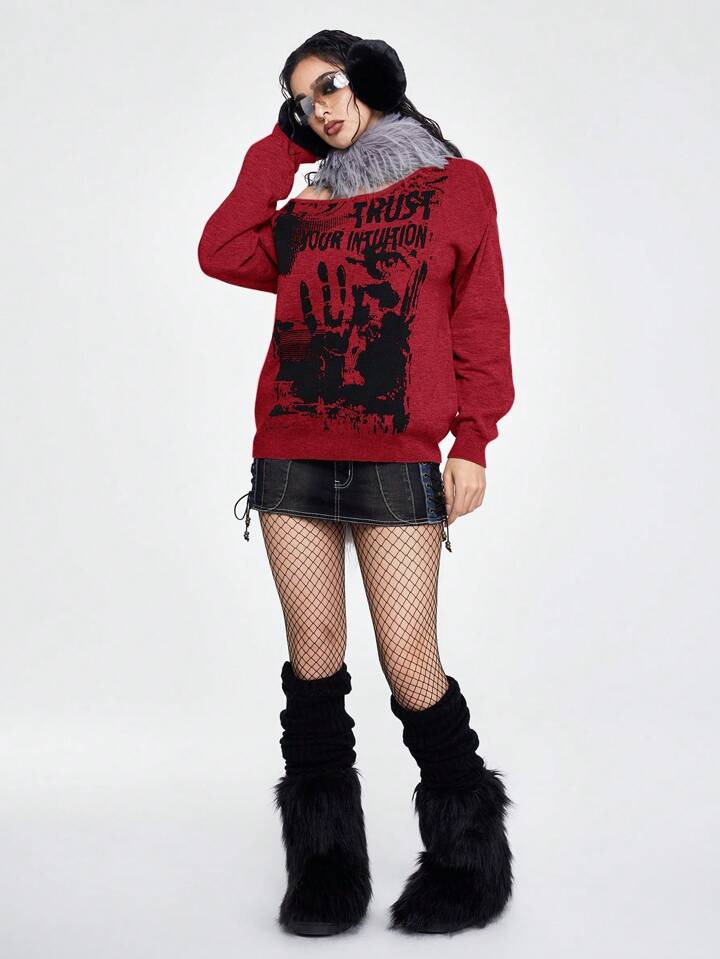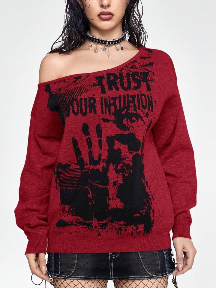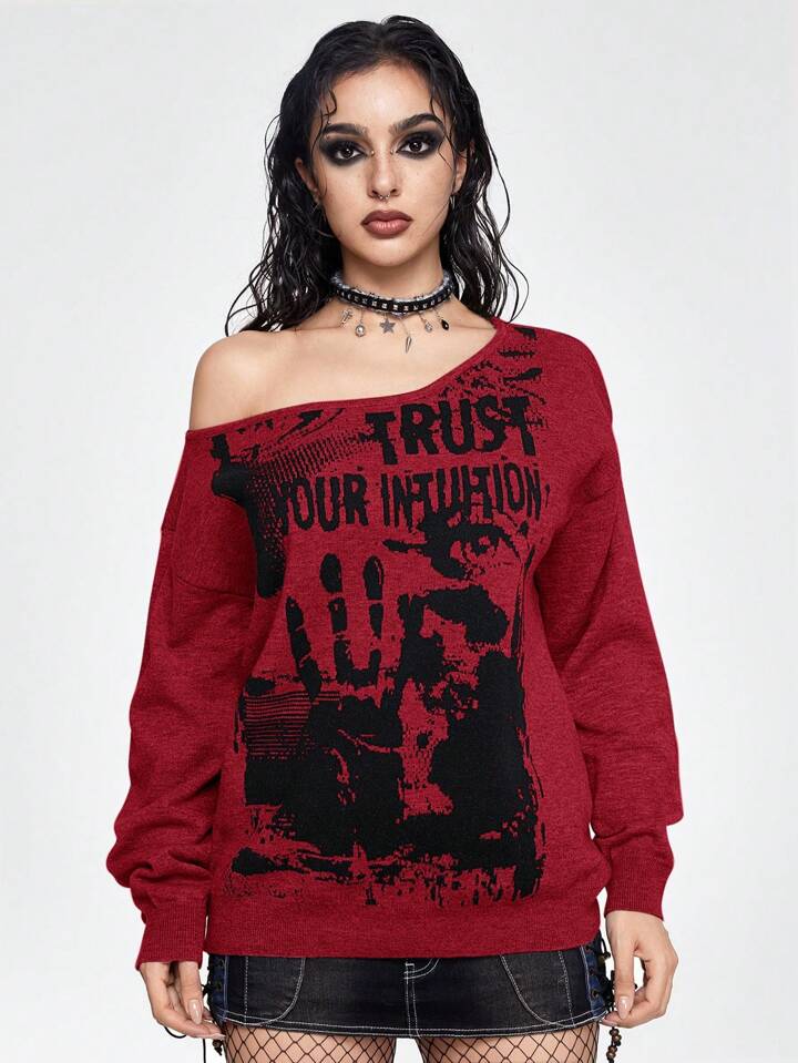 Grunge Punk Suéter asimétrico de cuello ancho con patrón gótico de festival de música vintage para mujer