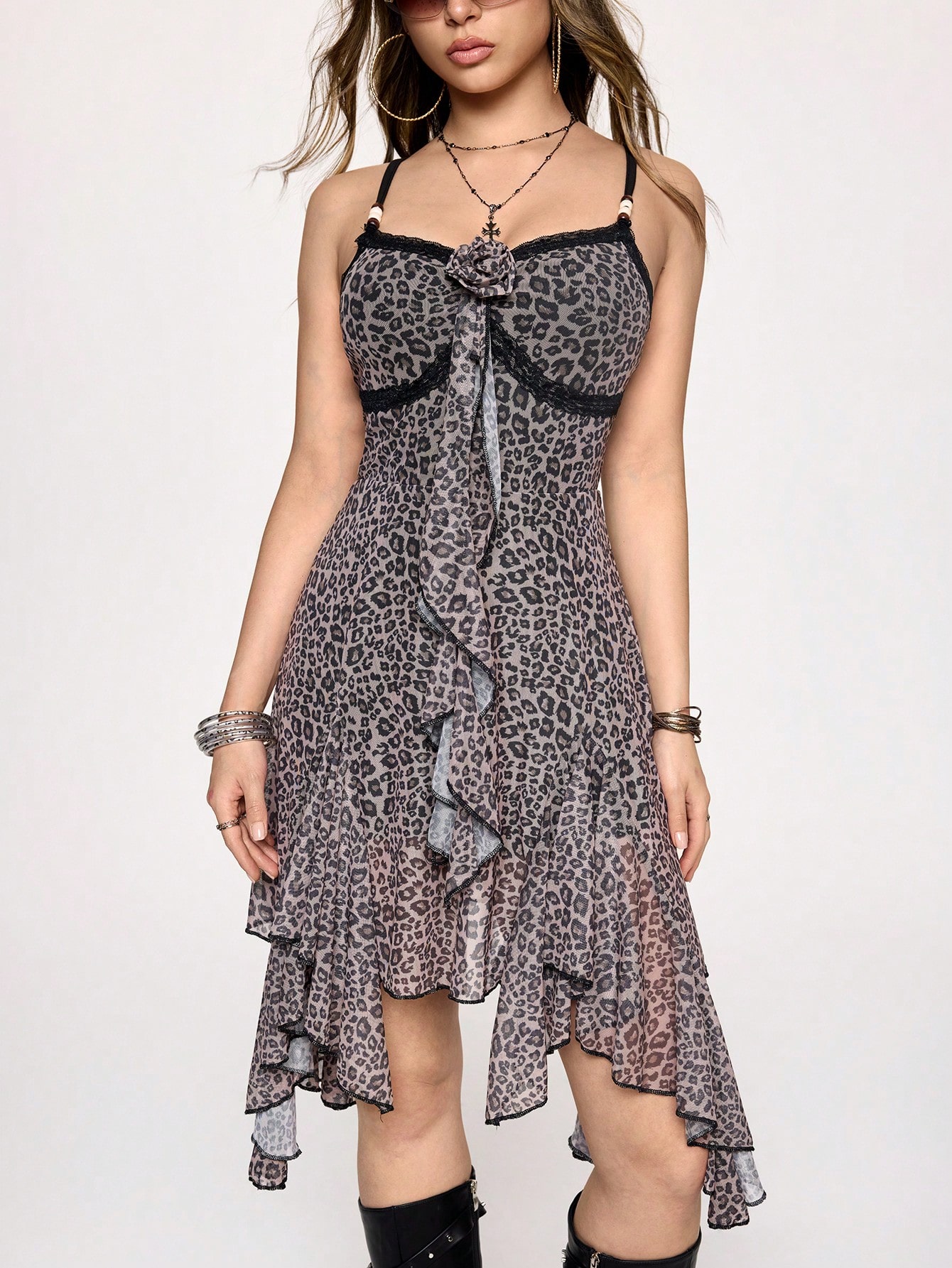 Grunge Punk Vestido mini asimétrico para mujer con combinación de leopardo, tul y encaje vintage